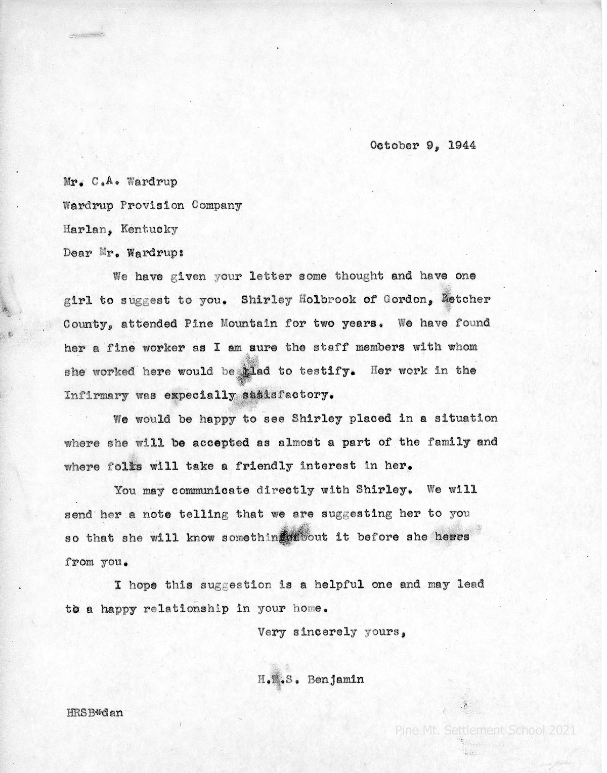 058 October 9, 1944. To Mr. C.A. Wardrup, Wardrup Provision Company, Harlan, KY, from Mr. Benjamin. In response to Wadrup’s letter, he can recommend one girl, Shirley Holbrook of Gordon, Letcher County, who was a PMSS student for two years; “a fine worker,” who had also worked in the Infirmary. “We would be happy to see Shirley placed in a situation where she will be accepted as almost a part of the family and where folks will take a friendly interest in her.”