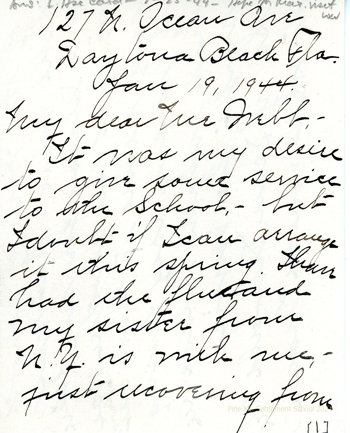 063-063c January 19, 1944. Four-page handwritten letter to Mr. Webb from Florence T. Webster, [063, page 1] who feels she should not work for PMSS [063b, page 2] this spring but stay in Florida during the “cold months,” due to the flu and her sister’s pneumonia. Tells about talks concerning mountain schools that she has scheduled at home in Massachusetts, [063a, page 3] which is the reason she wishes to visit PMSS. Asks about visiting in March. [063c, page 4] Closing.