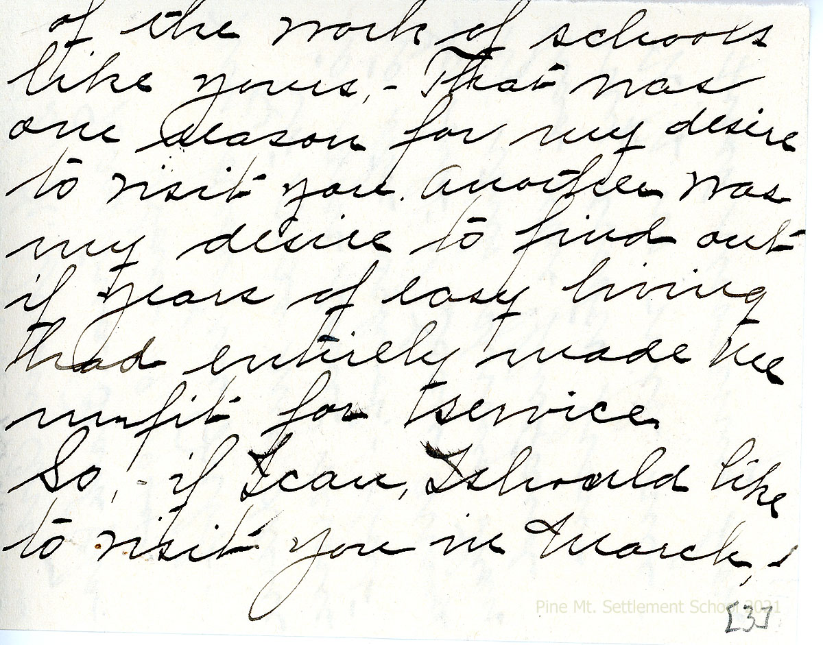 How you became interested in Pine Mountain: “Need employment badly. In a conversation with a graduate student here from the South, he suggested my trying your School, the School of the Ozarks in Missouri, The Berry Schools of Georgia, as places where they might be willing to accept an older man.” ….