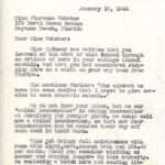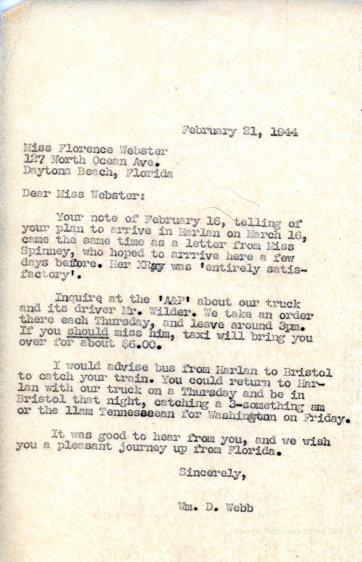062 January 12, 1944. To Miss Florence Webster, Daytona Beach, FL, from (unsigned, apparently Mr. Webb). “Miss Spinney has written that you learned of the work of this School through an article of hers in your college alumni monthly…” and that Miss Webster plans to visit PMSS. Since she has expressed desire to “give service to some mountain school,” Miss Webster is asked about her interest in working as a “relief housemother” at PMSS; describes the position.
