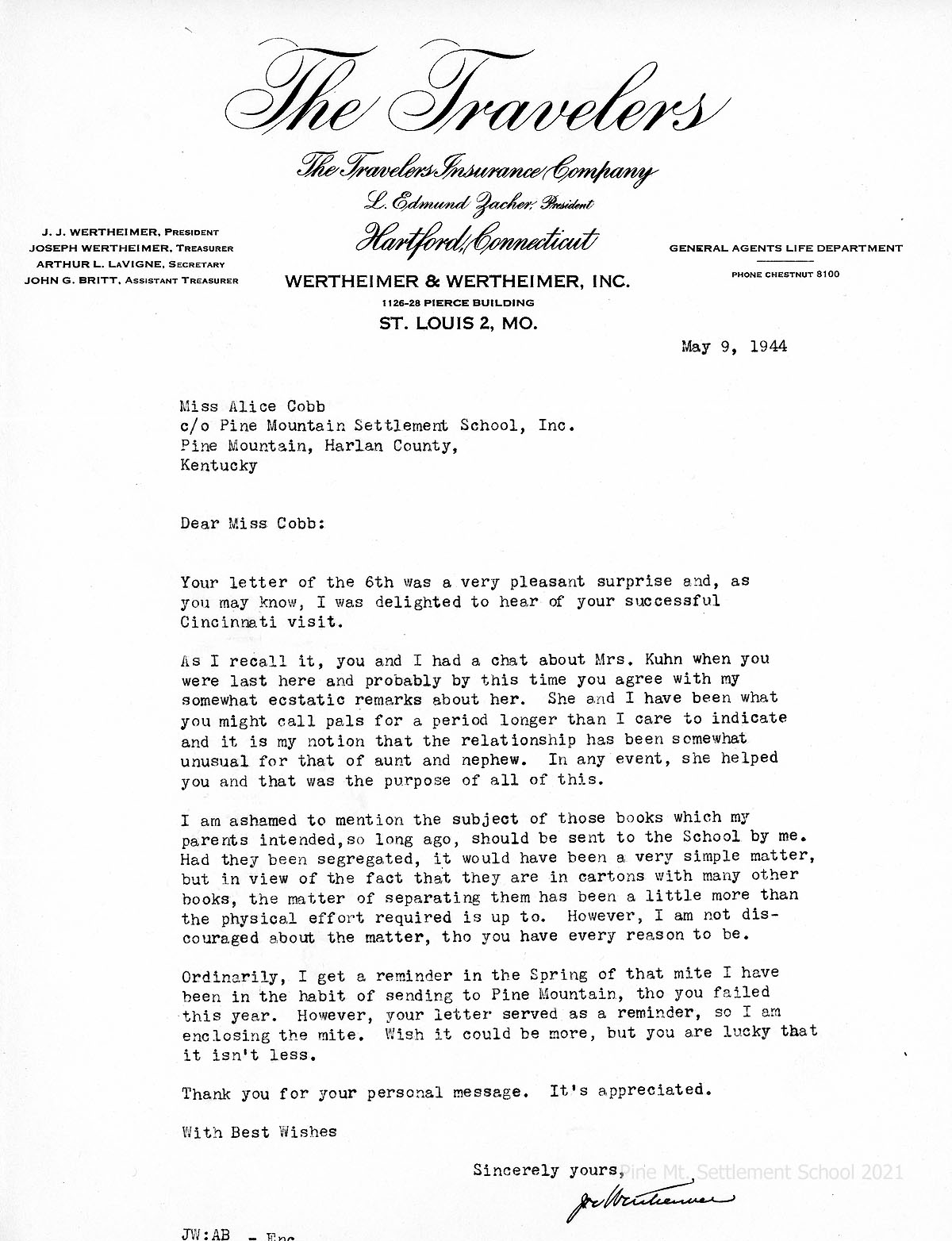 067 May 9, 1944. To Miss Alice Cobb from Joseph Wertheimer, Treasurer, The Travelers Insurance Company, Wertheimer & Wertheimer, Inc., St. Louis, MO., referring to Cobb’s letter of May 6 and her “successful Cincinnati visit.” Mentions their chat about his aunt, Mrs. Kuhn. He still needs to send the books donated by his parents; and encloses his “mite” (donation). “Wish it could be more, but you are lucky that it isn’t less.”