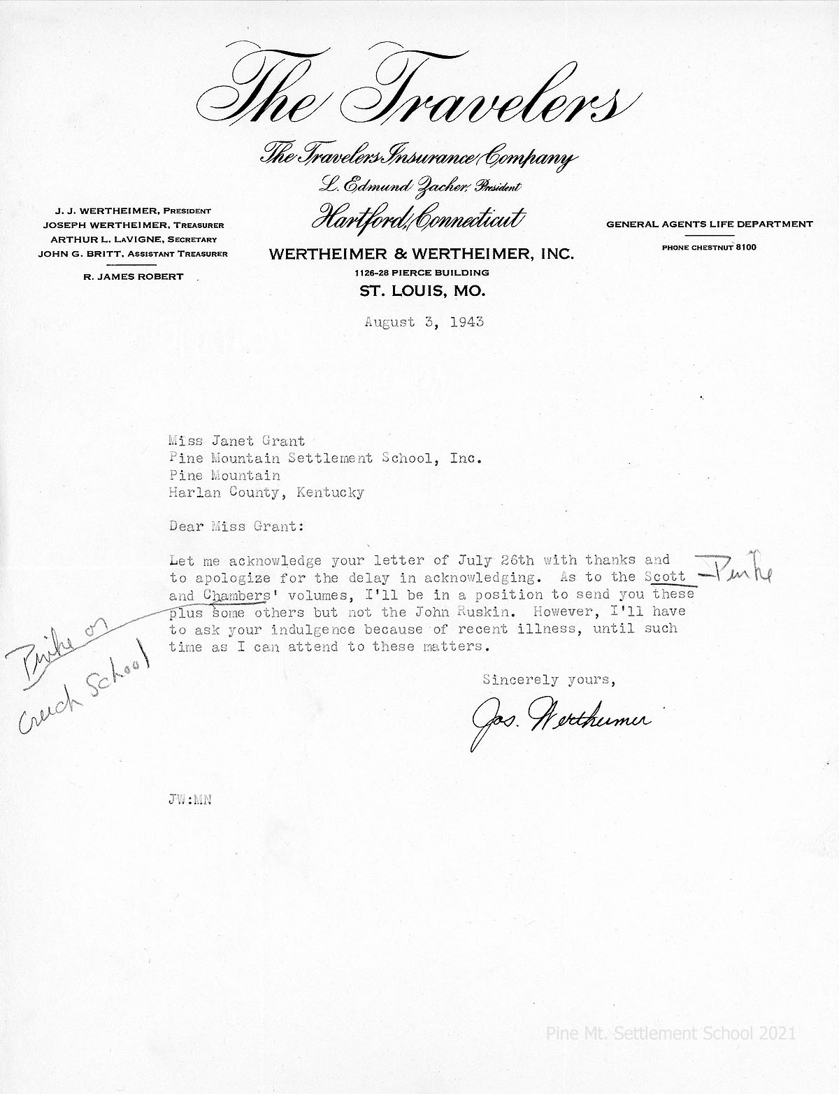 068 August 3, 1943. To Miss Janet Grant, PMSS, from Joseph Wertheimer, Treasurer, The Travelers Insurance Company, Wertheimer & Wertheimer, Inc,. St. Louis, MO. Responding to her July 2th letter, he will be sending the Scott and Chambers’ books. (Notations indicate the Scott volume for”Pinke” and Chambers’ volume for “Pinke or Creech School.”)