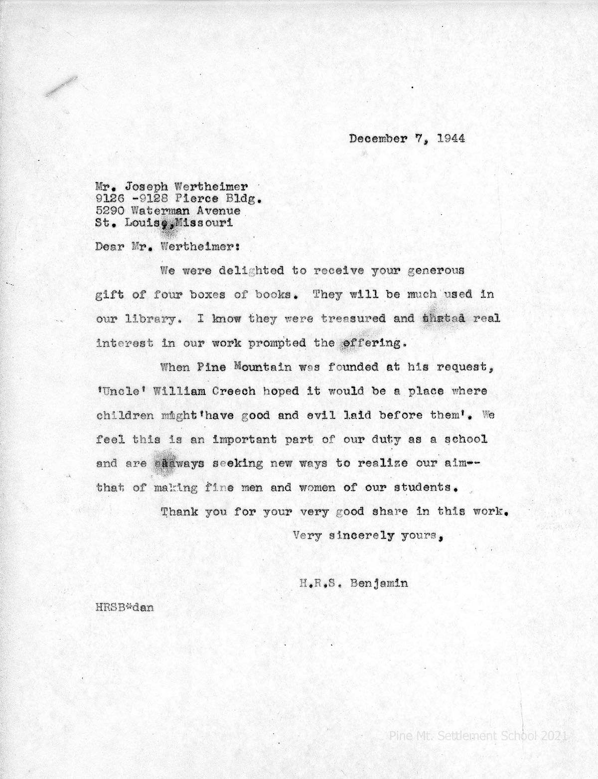 069 December 7, 1944. To Wertheimer from Mr. Benjamin, thanking him for his gift of four boxes of books. “They will be much used in our library.” Mentions “Uncle” William Creech’s hope and the School’s mission. “Thank you for your very good share in this work.”