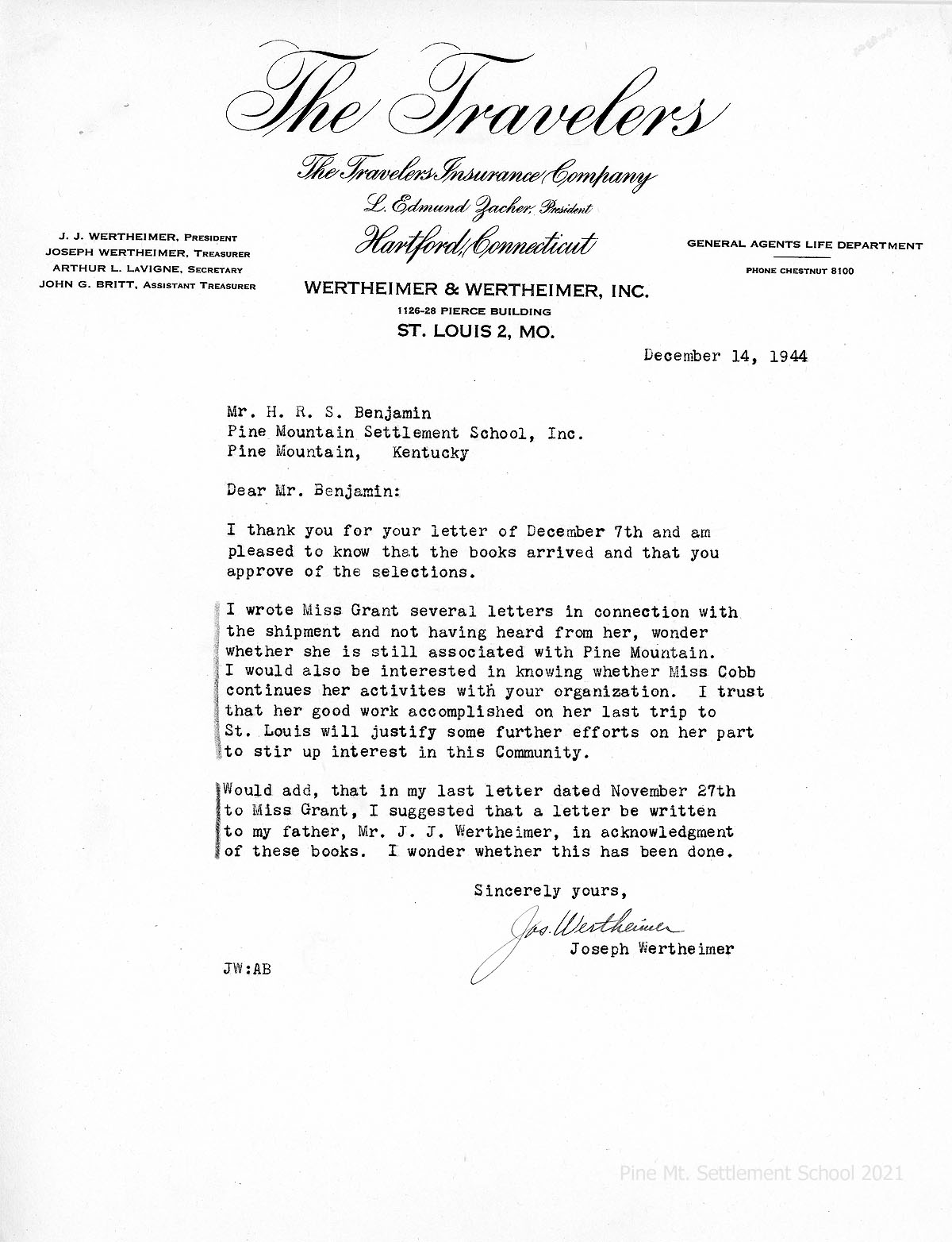 070 December 14, 1944. To Mr. Benjamin from Wertheimer, who is pleased that the books arrived and are appropriate. He asks if Miss Grant and Miss Cobb continue their work for PMSS; suggests that Cobb visit St. Louis to raise interest in PMSS; also suggests that a letter of acknowledgment of the books be sent to his father, Mr. J.J. Wertheimer.