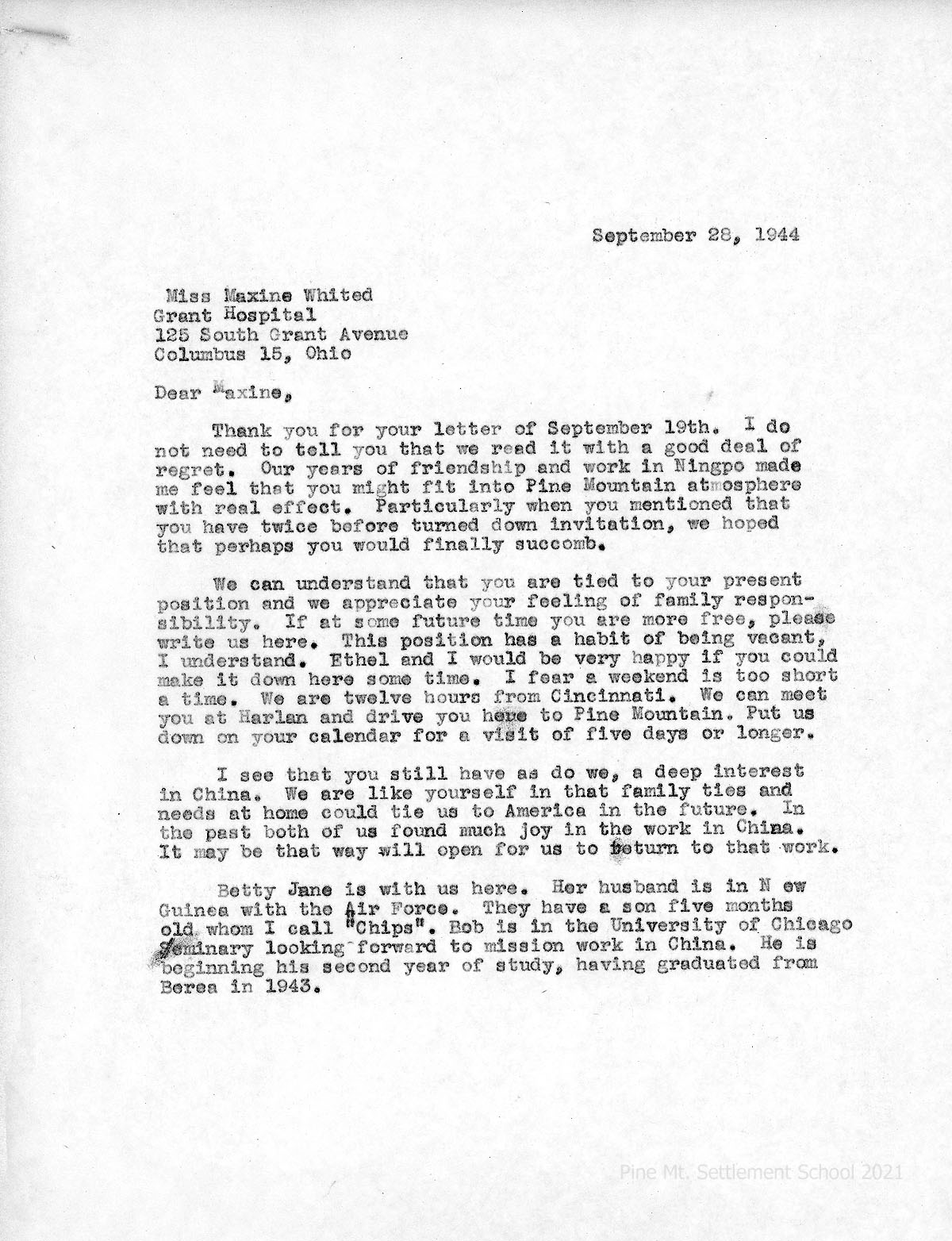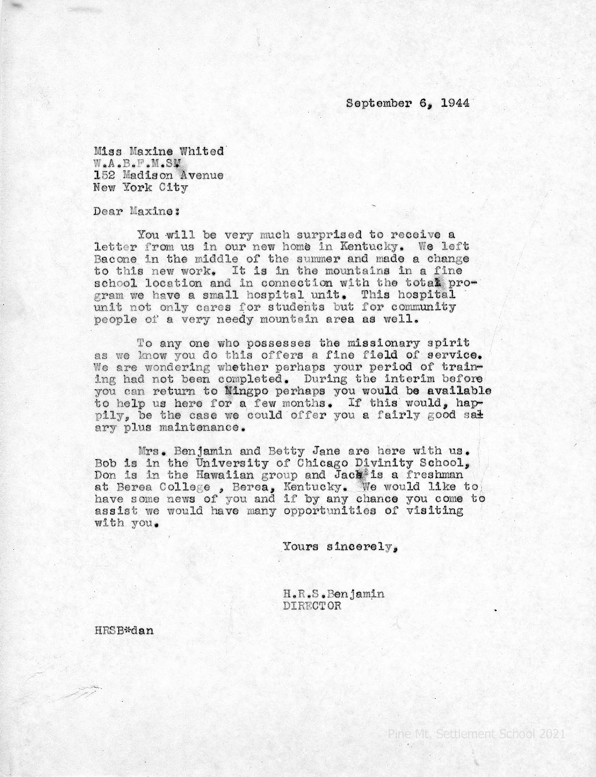 073-073a September 28, 1944. Two-page letter to Whited from Mr. Benjamin, who regrets she cannot come to PMSS. “Our years of friendship and work in Ningpo made me feel that you might fit into Pine Mountain atmosphere with real effect.” Asks her for recommendations for the position; invites her to visit PMSS; gives additional updates about his children and grandchild.