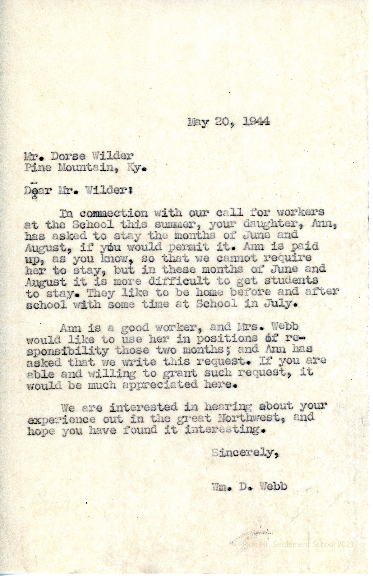 075 May 20, 1944. To Mr. Dorse Wilder, Pine Mountain, KY, from Mr. Webb, asking if his daughter Ann can stay at the School as a worker in June and August.