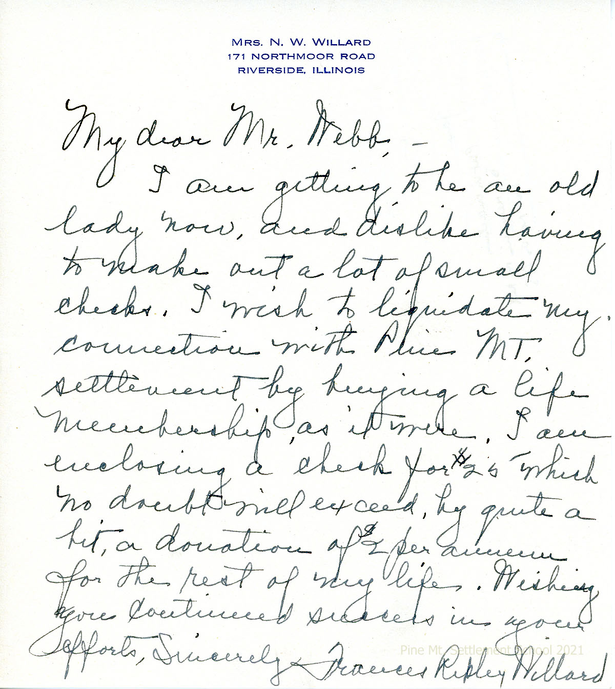 076 N.D. To Mr. Webb from Frances Ripley Willard, (Mrs. N.W. Willard), Riverside, IL,  enclosing a $25 check for a “life membership.” She explains that “I am getting to be an old lady now, and dislike having to make out a lot of small checks.”