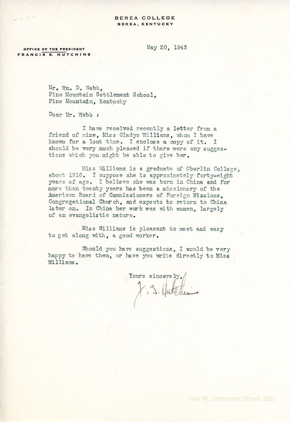 079 May 20, 1943. To Webb from Francis S. Hutchins, President, Berea (KY) College, enclosing a letter from Miss Gladys Williams, a longtime friend of his; provides her background details; asks if Webb has suggestions for her.