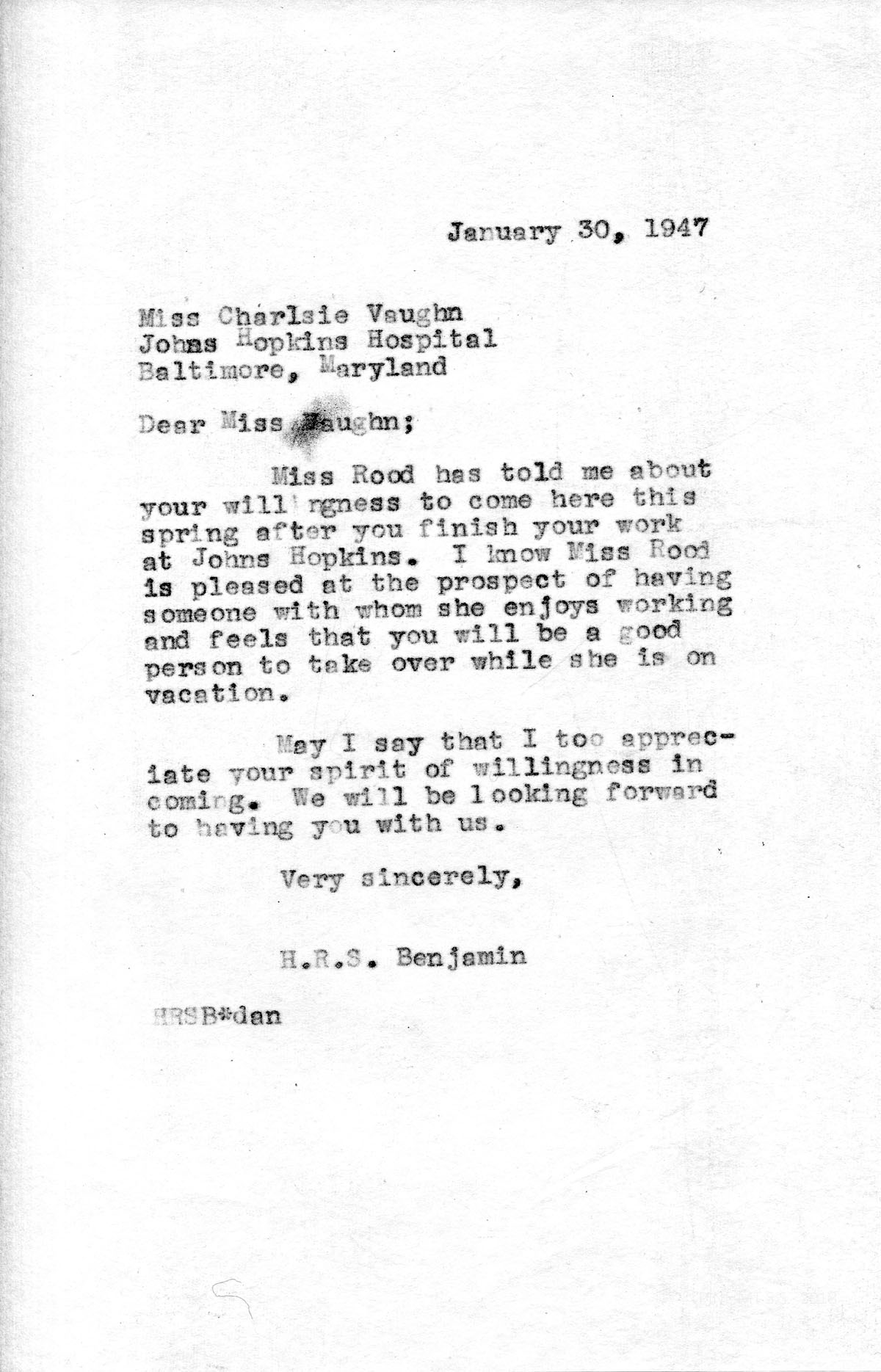 [001] January 30, 1947. To Miss Charlsie Vaughn, Johns Hopkins Hospital, Baltimore, MD, from H.R.S. Benjamin, PMSS Director, who heard from Miss (Grace) Rood that Vaughn was willing to come to PMSS this spring after finishing at Johns Hopkins; Benjamin and Miss Rood look forward to having her at PMSS.
