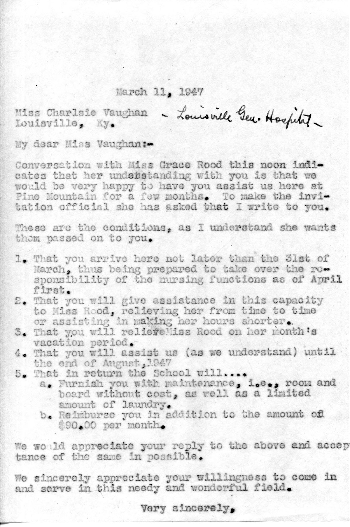 [002] March 11, 1947. To Vaughn at Louisville General Hospital from [unsigned], who was asked by Rood to “make the invitation official” with a list of conditions, including arrival date (before April 1), terms of assisting and relieving Miss Rood, end date (August 1947). In return, the School will furnish maintenance (room and board without cost, limited laundry) at $90 per month. Asks that Vaughn reply to these terms.