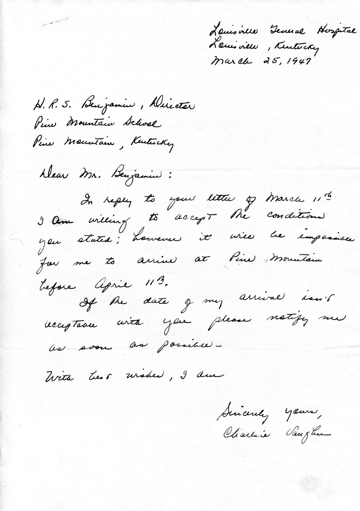 [008] June 30, 1947. To “Sirs” at the Institute of Living, Hartford, CT, from Benjamin, commenting on Charlsie Vaughn: (1) employed at PMSS for 3 months, (2) a PMSS graduate, “serious minded and a good worker,” (3) graduated in spring 1947 from Louisville General Hospital and has passed the State Board examination, (4) had one year’s work at Lincoln Memorial University, Harrogate, TN, and (5) “…a very good nurse. She possesses a pleasing personality, is dependable, and shows a good deal of initiative in her work….We, personally, enjoy her very much.”