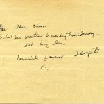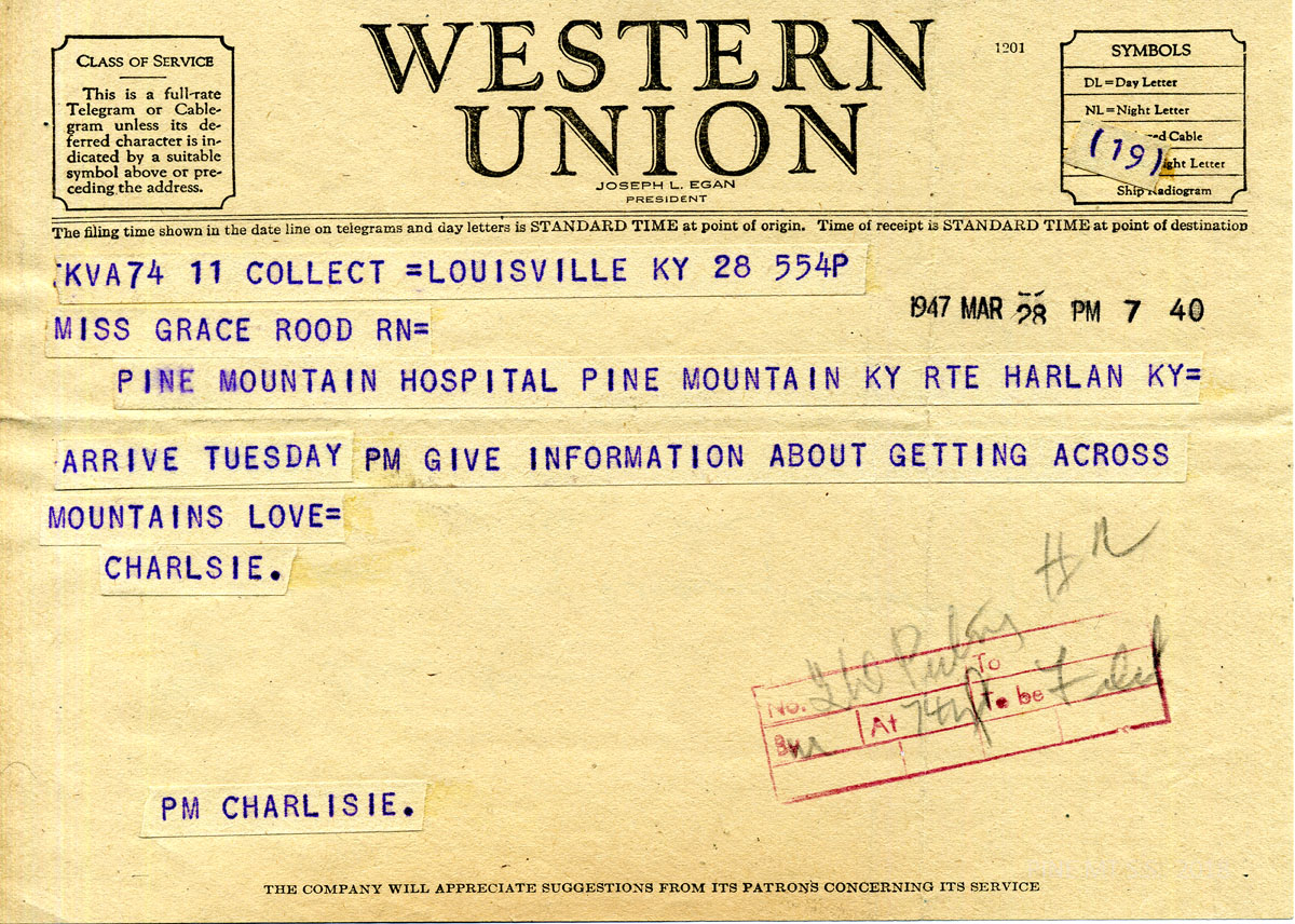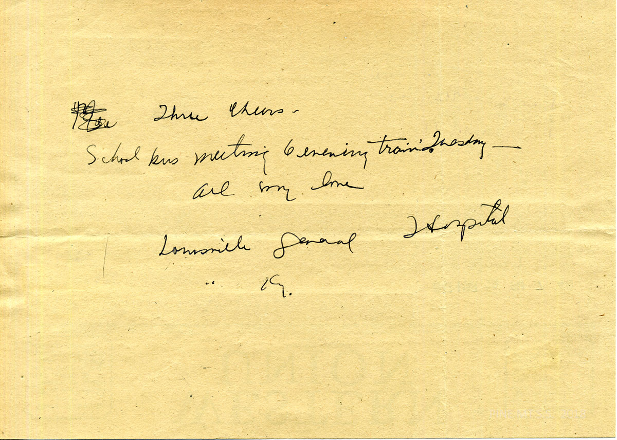 [004a] N.D. Handwritten notation on reverse side of 3/28 telegram (possibly a draft of Miss Rood’s response): “Three cheers. School bus meeting 6 evening train Tuesday – all my love. Louisville General Hospital, Louisville, Ky.”