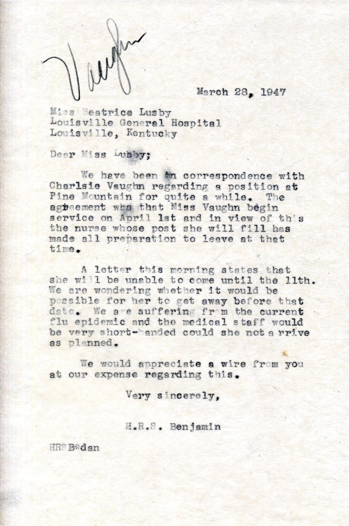 [006] March 28, 1947. To Miss Beatrice Lusby, Louisville General Hospital, from H.R.S. Benjamin, asking her to let Vaughn leave for PMSS before the 11th to fill in during the current flu epidemic before Miss Goodnow leaves on the 1st.