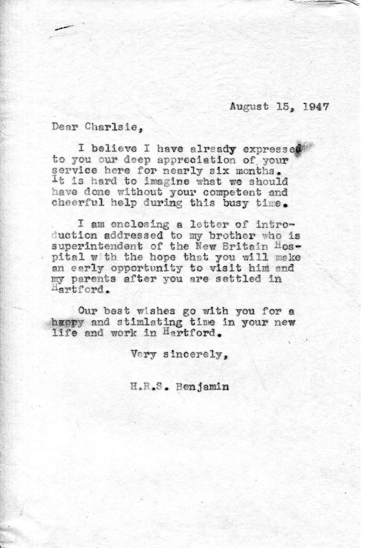 [009] August 15, 1947. To Vaughn from Benjamin, expressing “deep appreciation of your service here for nearly six months. It is hard to imagine what we should have done without your competent and cheerful help during this busy time.” Encloses a letter of introduction addressed to his brother, the superintendent of the New Britain Hospital. Sends best wishes for a “happy and stimulating time in your new life and work in Hartford.”