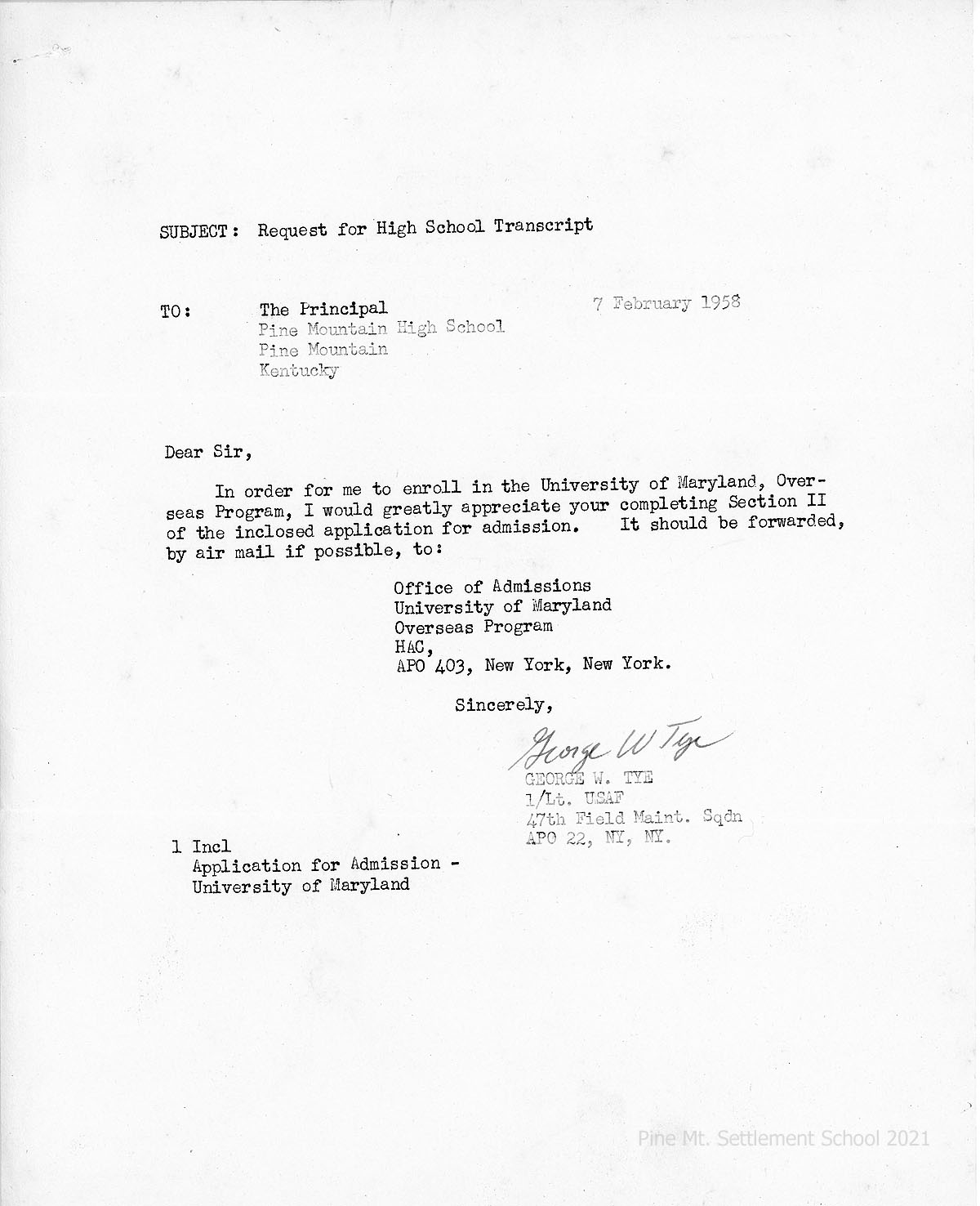 [28] February 7, 1958. To “Principal” from George W. Tye, 1/Lt. USAF, APO, NYC, enclosing an application of admission to University of Maryland, Overseas Program, to be completed.