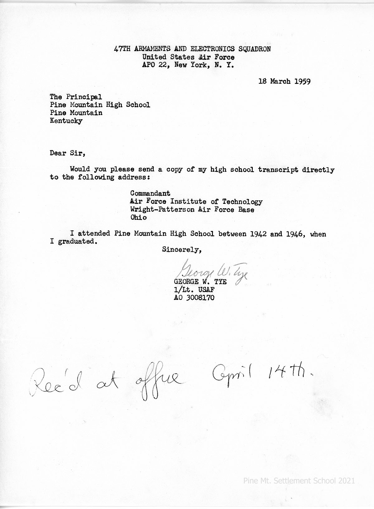 [31] March 18, 1959. To “Principal,” from George W. Tye, 47th Armaments and Electronics Squadron, USAF, APO, NYC, requesting that his transcript be sent to the Commandant, Air Force Institute of Technology, Wright-Patterson Air Force Base, Ohio.