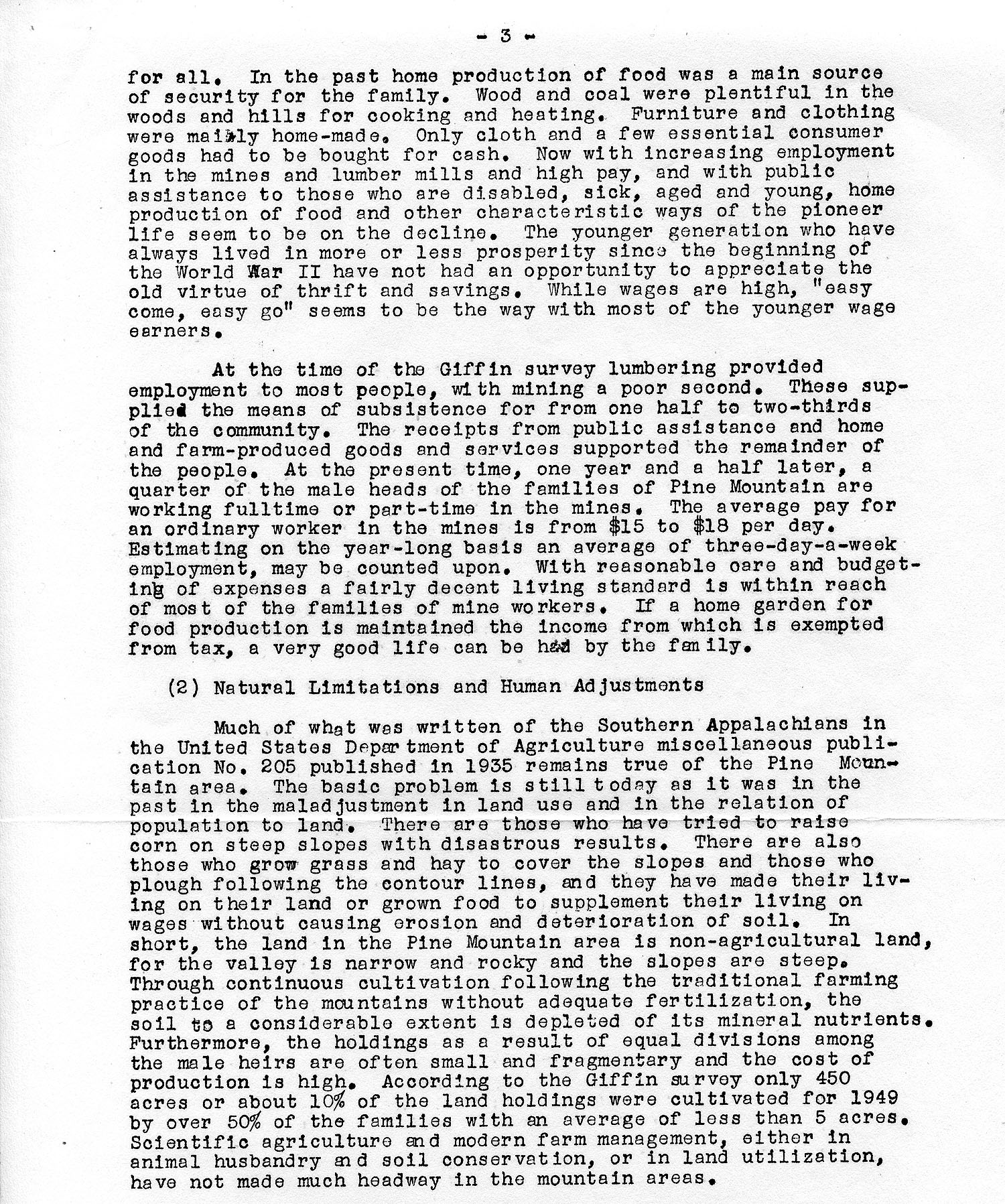 In his brief but thorough survey, Chang evaluates not only the educational needs but also the medical and agricultural needs of the community served by Pine Mountain School. He builds on the more sociological, formal and in-depth study of his colleague, Dr. Roscoe Giffin and like Giffin, he is quick to acknowledge the limiting aspects of the regional geography, particularly on the practices of subsistence farming. He cites the prior Giffin study that indicated “only about 450 acres or 10% of the land holdings of families were cultivated in 1949 by over 50% of the families with an average of less than 5 acres.” In some ways, it was the Ellen Churchill Semple model narrative of economic possibilities limited by nature. But, to the Semple model Chang added the limitations of the current and evolving (U.S.) economic system. In his study, Chang cited only limited feasible employment for those who dwelled in the area such as mining, manufacturing, trades or part-time farming, and development of logging and forest products. Ironically, or perhaps, not, Semple accompanied Pine Mountain Settlement School founder Katherine Pettit and Berea instructor Penniman, on her first formal trip into Eastern Kentucky in 1899.