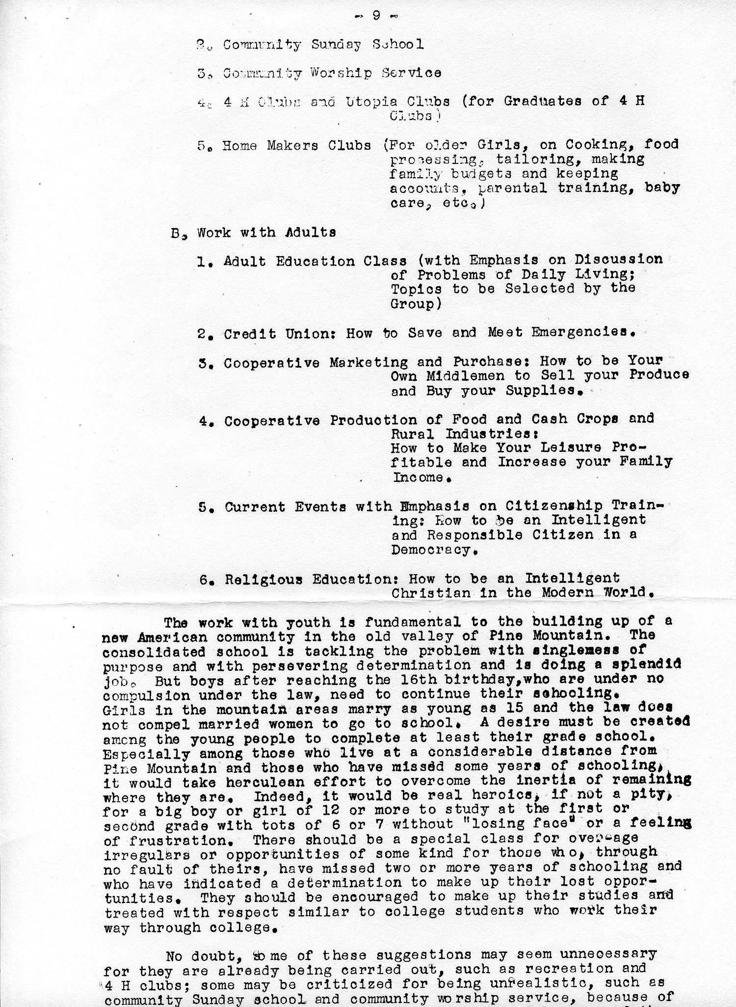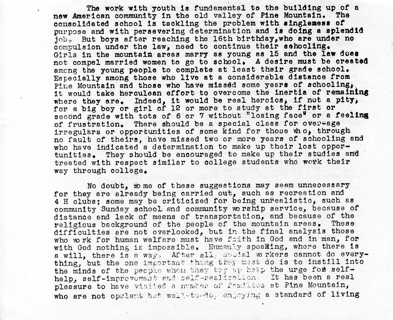 To be community-centric Pine Mountain Settlement School has to include in its planning different types of adult education without sacrificing the efficiency of its consolidated school. The belief is that education for children and for adults, as has been pointed out before, are complementary and mutually strengthening. The excellent teamwork among the staff members of the consolidated school will be further expanded and extended to the work with and for the community. While the community organizer will serve as the main transmission line between the community and the school, there are many other live wires connecting these two ends, through the children of the school, patients at the hospital and cooperators with and visitors to the farm and workshops. The members of the staff of Pine Mountain Settlement School will no longer be individual school teachers and specialized personnel in health, agriculture, woodwork, weaving and administration, but a team of purposeful community builders. A team of twenty community builders following an integrated plan will accomplish many times more than what can be accomplished by twenty individual workers. Through their different lines of service, they will present to the people of the community the same ideals and ideas of the Christian way of life, follow the same scale of Christian values and press forward towards the same goal of a prosperous, enlightened, and happy Christian community. The teamwork of the whole staff rather than the brilliant work of any individual will carry the day in making Pine Mountain the community-centered school.