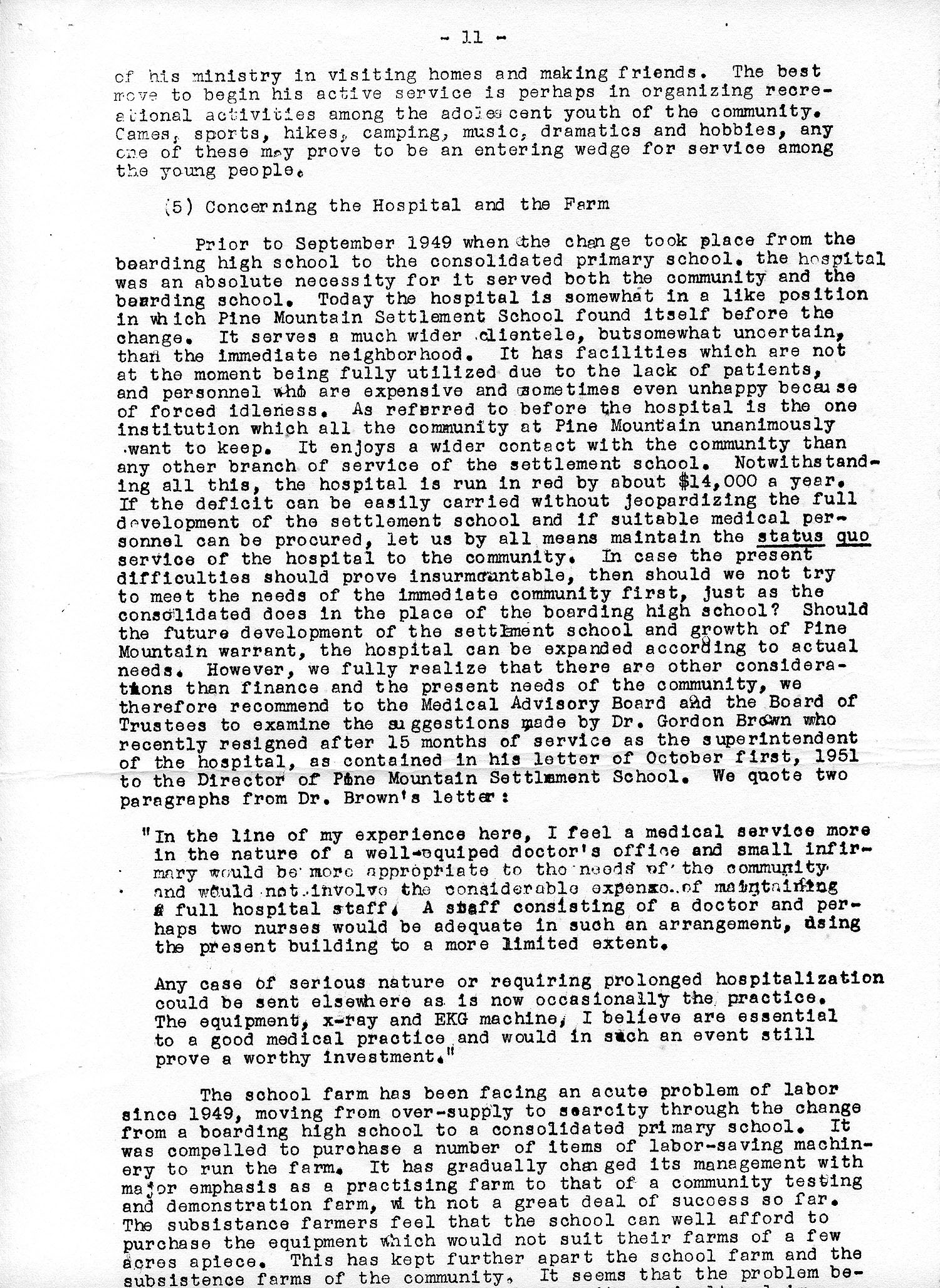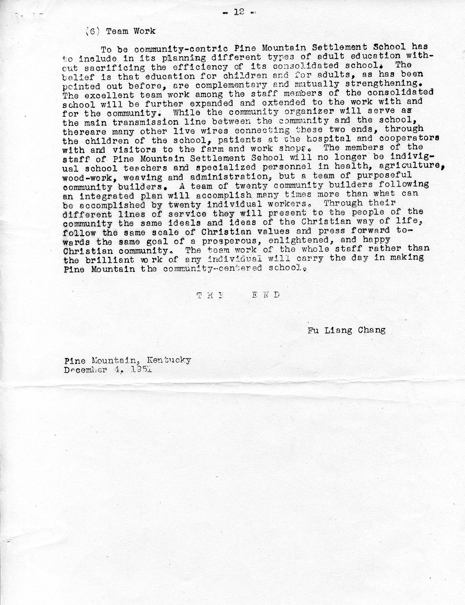 The brief eleven-page survey conducted in December of 1951, by Chang, an employee of Berea College, was made at the request of Dr. Francis S. Hutchins, President of Berea, and recently assigned President of the Pine Mountain Settlement School Board of Trustees. The study was necessitated by the dire financial situation of the boarding school brought about by the shift of educational programs within the geographic region and the evolving post-war economics.Cooperative and consolidated schools or, more commonly known as Community Schools were seen as new and promising educational models. In 1951 Pine Mountain joined with the Harlan County School system in the adoption of the new consolidated school model. The shared responsibility brought much-needed revenue to the settlement school from the Harlan County Board of Education and enabled continuing maintenance of the large infrastructure of the settlement. Teacher’s salaries, bus drivers and bus maintenance, as well as rental income for the classroom space paid through the Harlan County Board of Education, significantly eased this difficult transition period of the School and ended the boarding school.