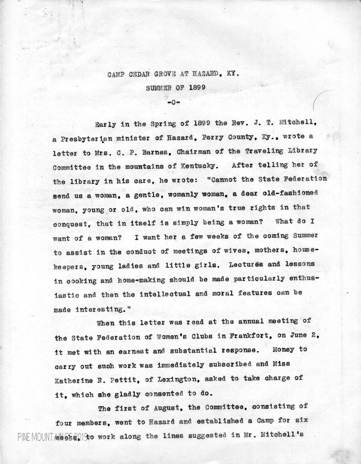 Early in the Spring of 1899 the Rev. J.T. Mitchell, a Presbyterian minister of Hazard, Perry County, Ky., wrote a letter to Mrs. C.P. Barnes, Chairman of the Traveling Library Committee in the Mountains of Kentucky. After telling her of the library in his care, he wrote: