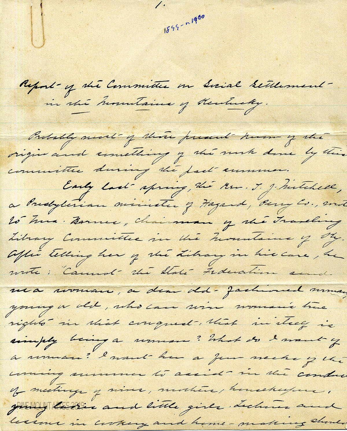 Report of the Committee on Social Settlements in the Mountains of Kentucky, presented at the State Federation of Women’s Clubs annual meeting, c. 1899. Possibly written by Katherine Pettit.