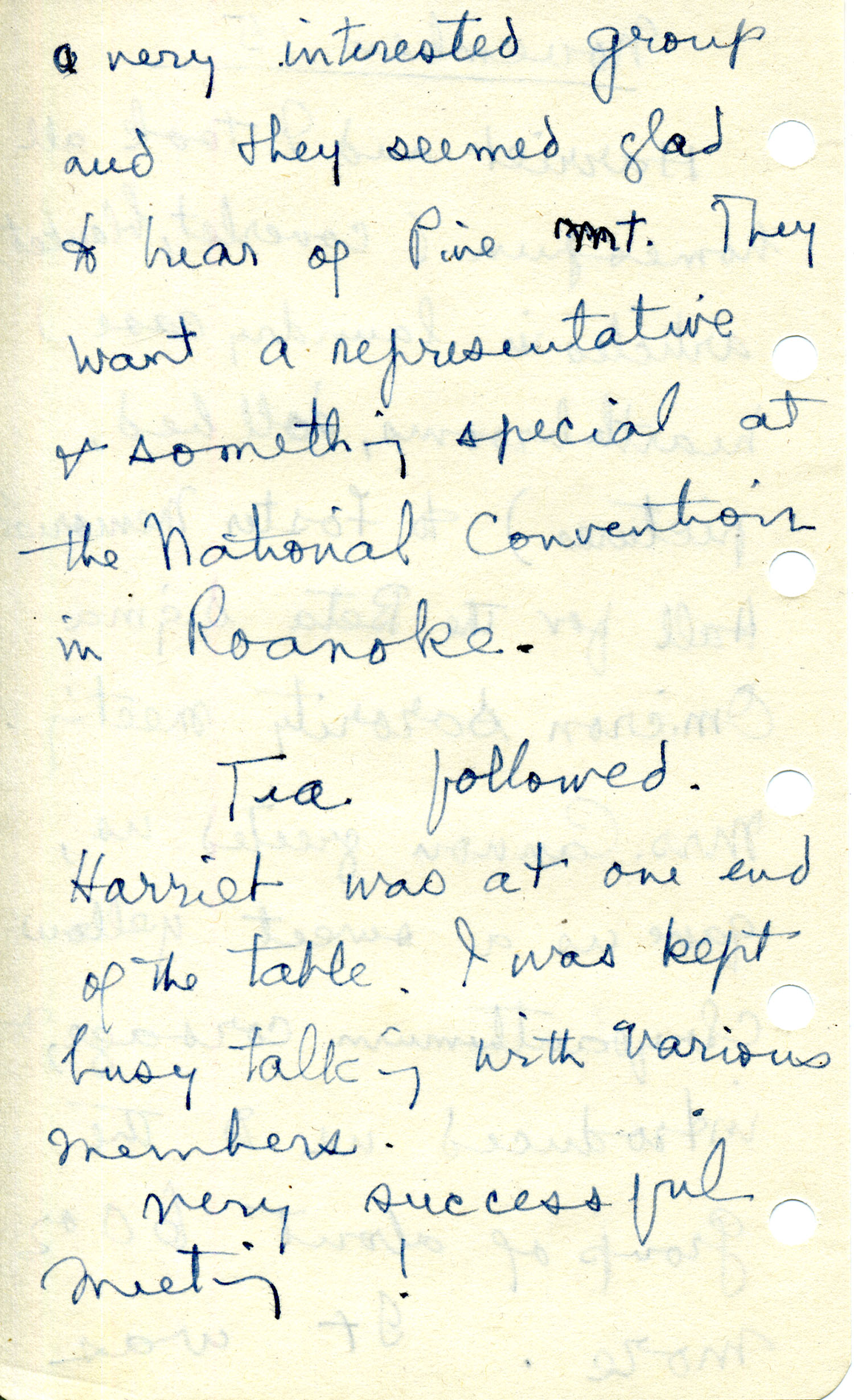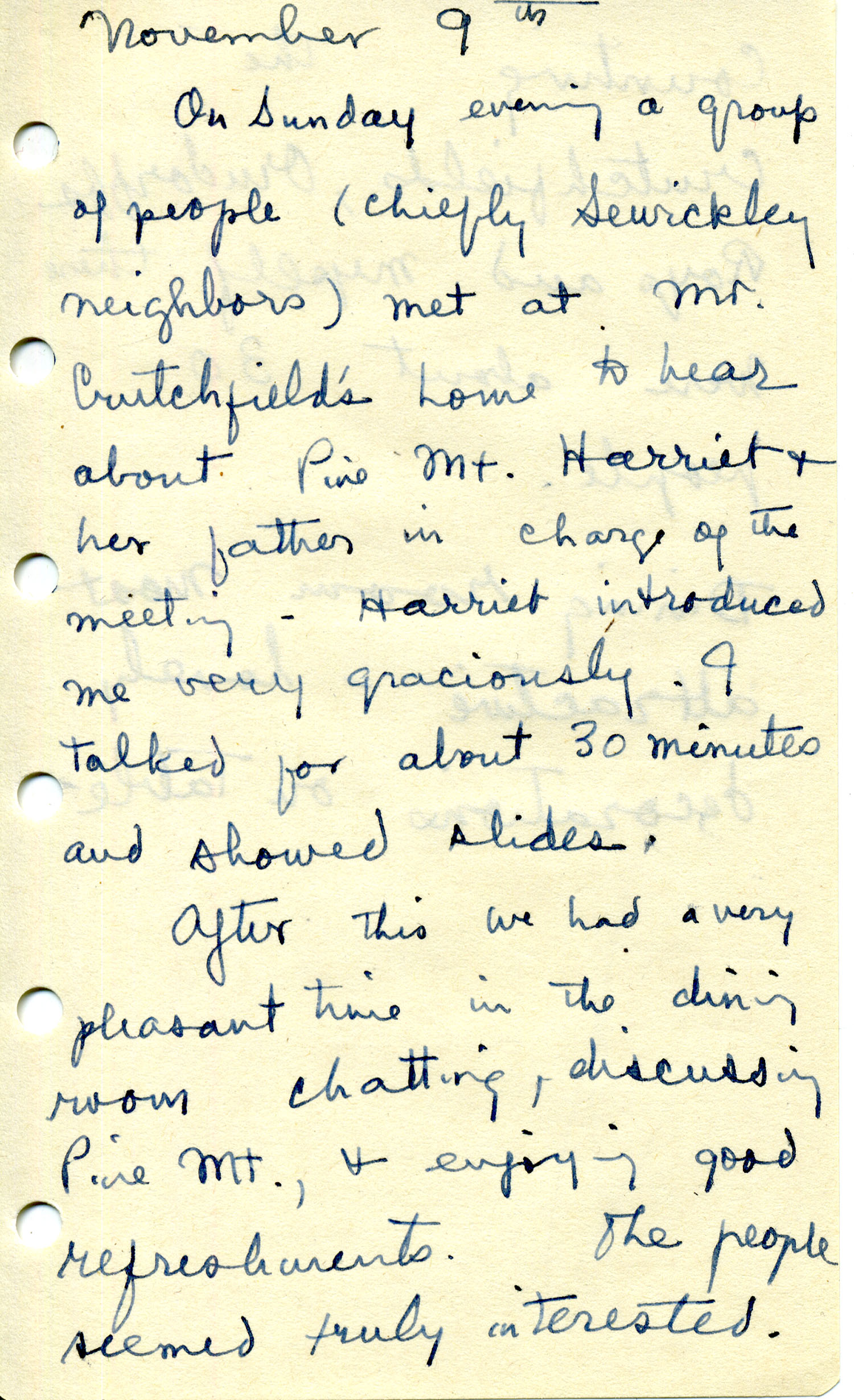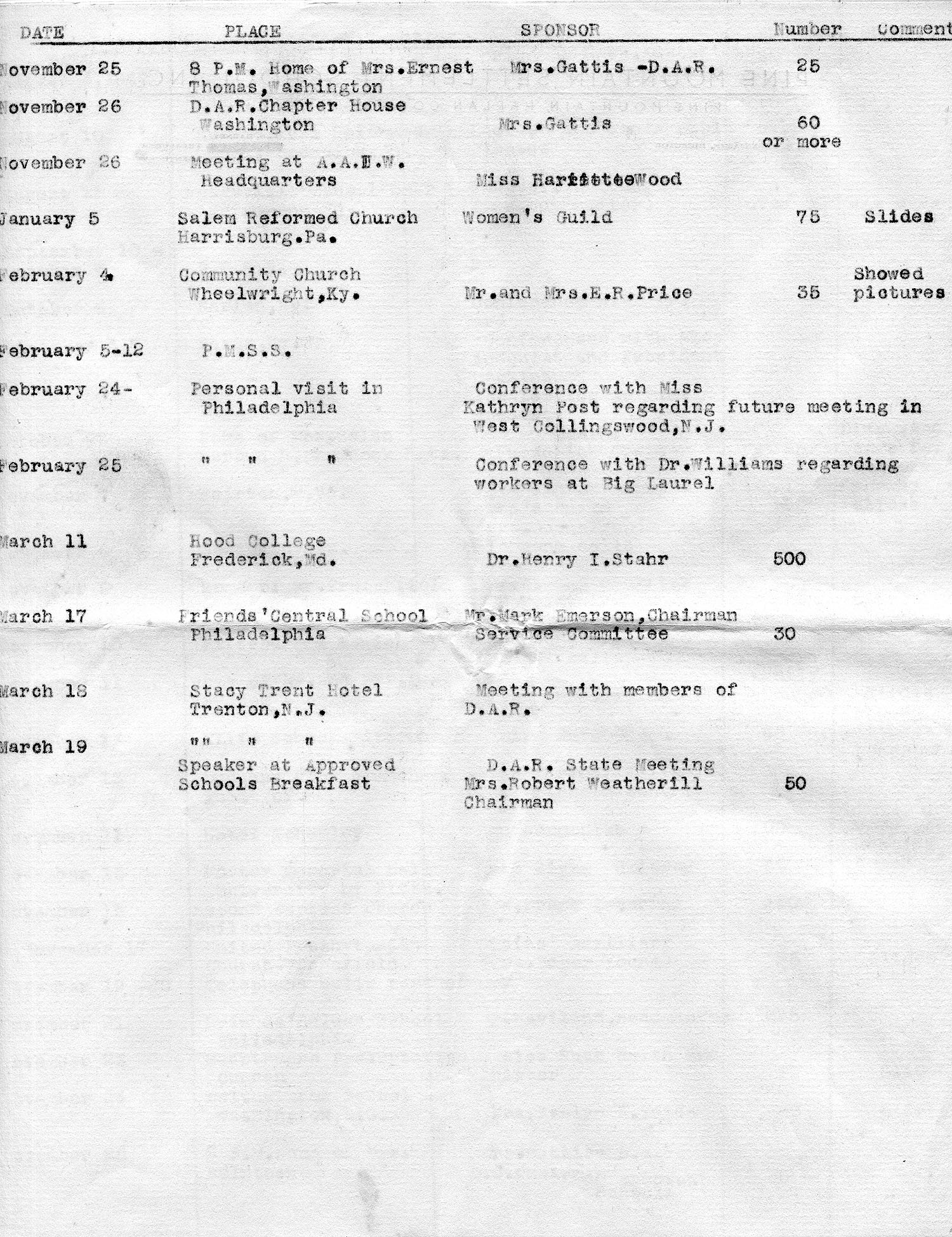 From late 1946 through 1949 Margaret Motter was given the responsibility of representing Pine Mountain Settlement School to the broader communities of interest, mainly the Northeast. She traveled to major metropolitan areas as well as towns that had Pine Mountain connections, to give short talks and to show slides of the institution. She carefully kept a record of her visits and in some cases copies of her remarks about the School. This record provides a unique opportunity to look back at the School through the development mantra of the institution. The records are also testimony to the broad ranging contacts the School maintained through the 1940s.