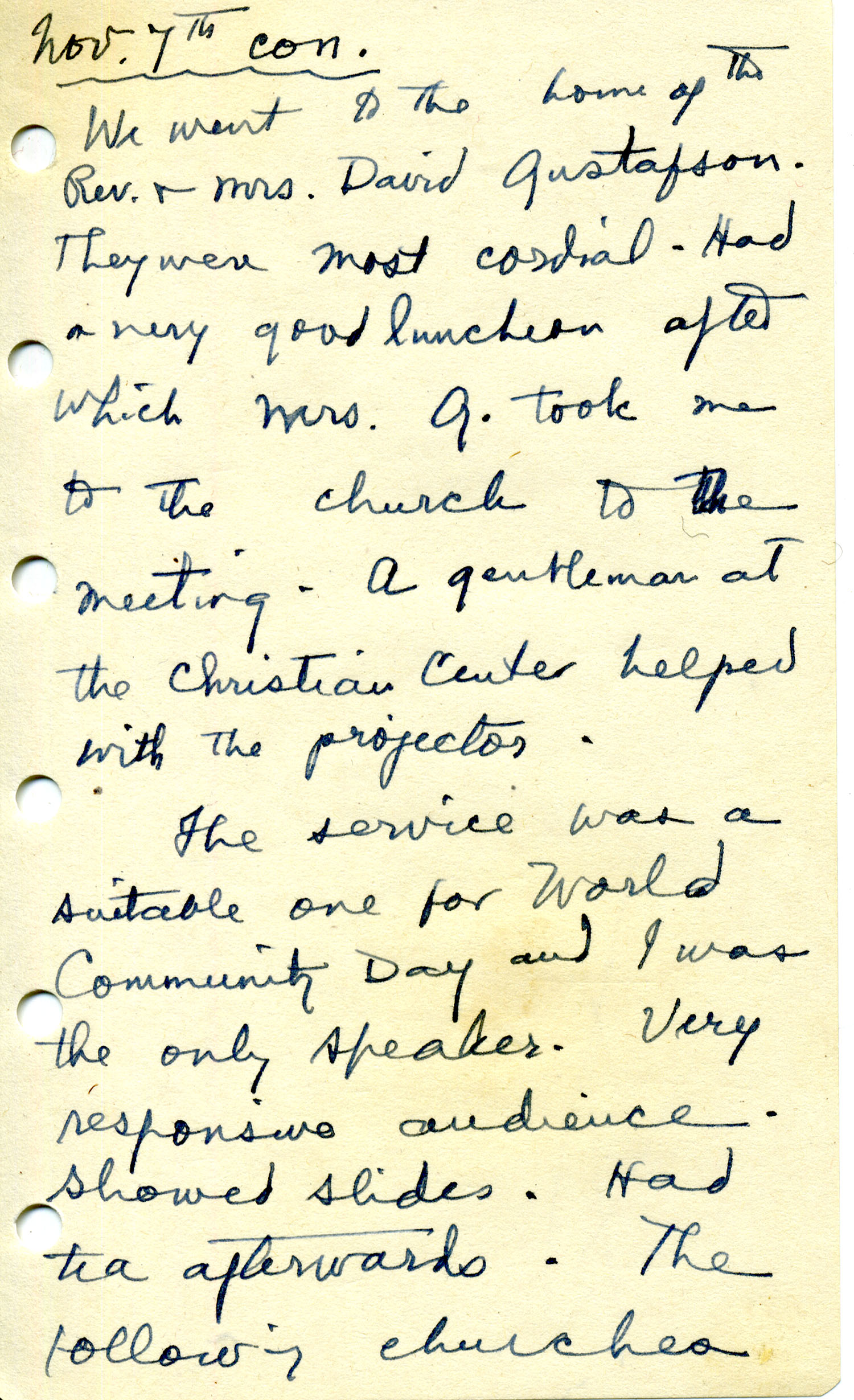 November 7 | Weirton, W. Va. | Interchurch group - Women's Guild (Mrs. Gustafson) | 60 | |