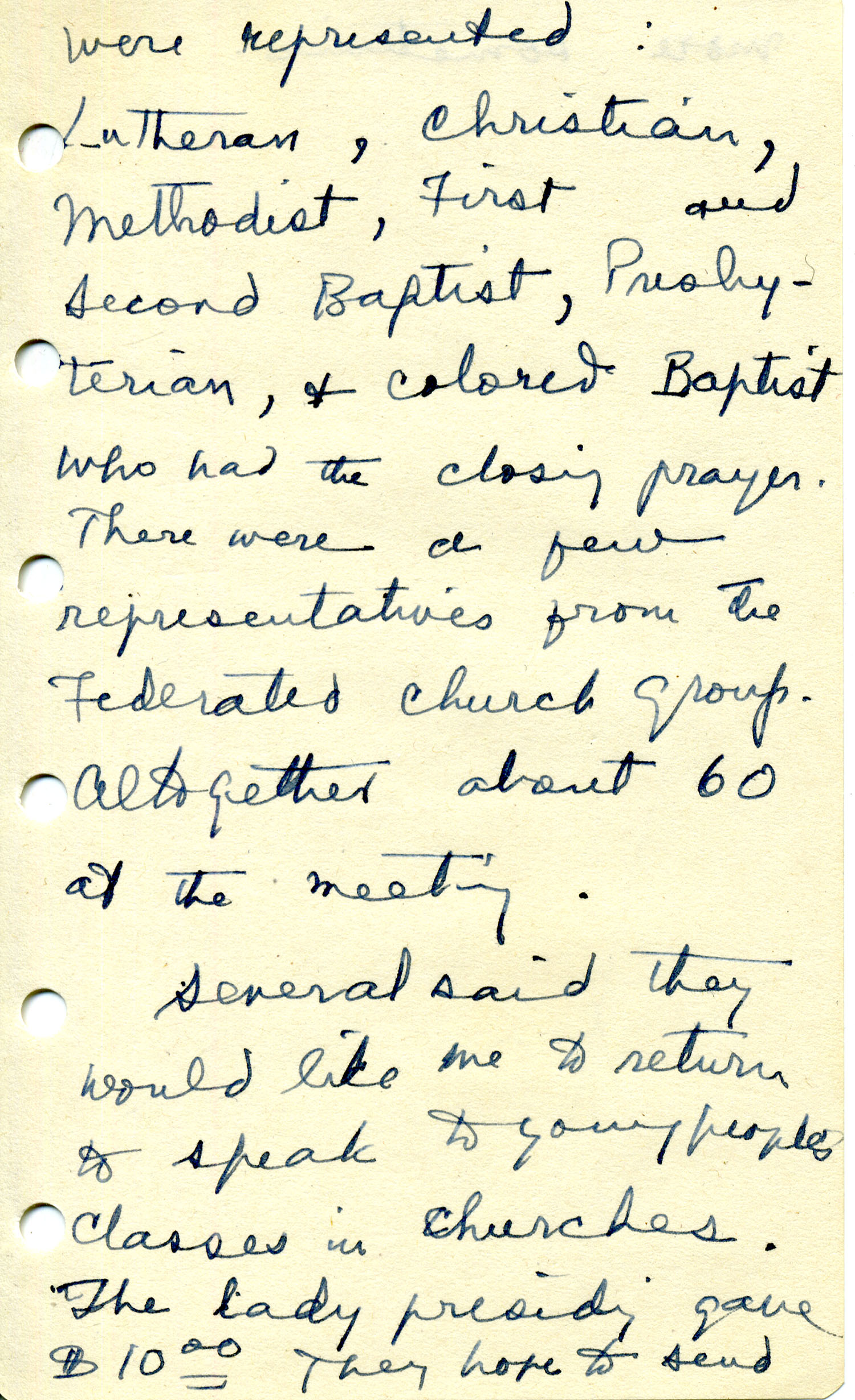 November 23 | Swarthmore Presbyterian Church | Miss Ruth Smith and minister | 50 | Slides |