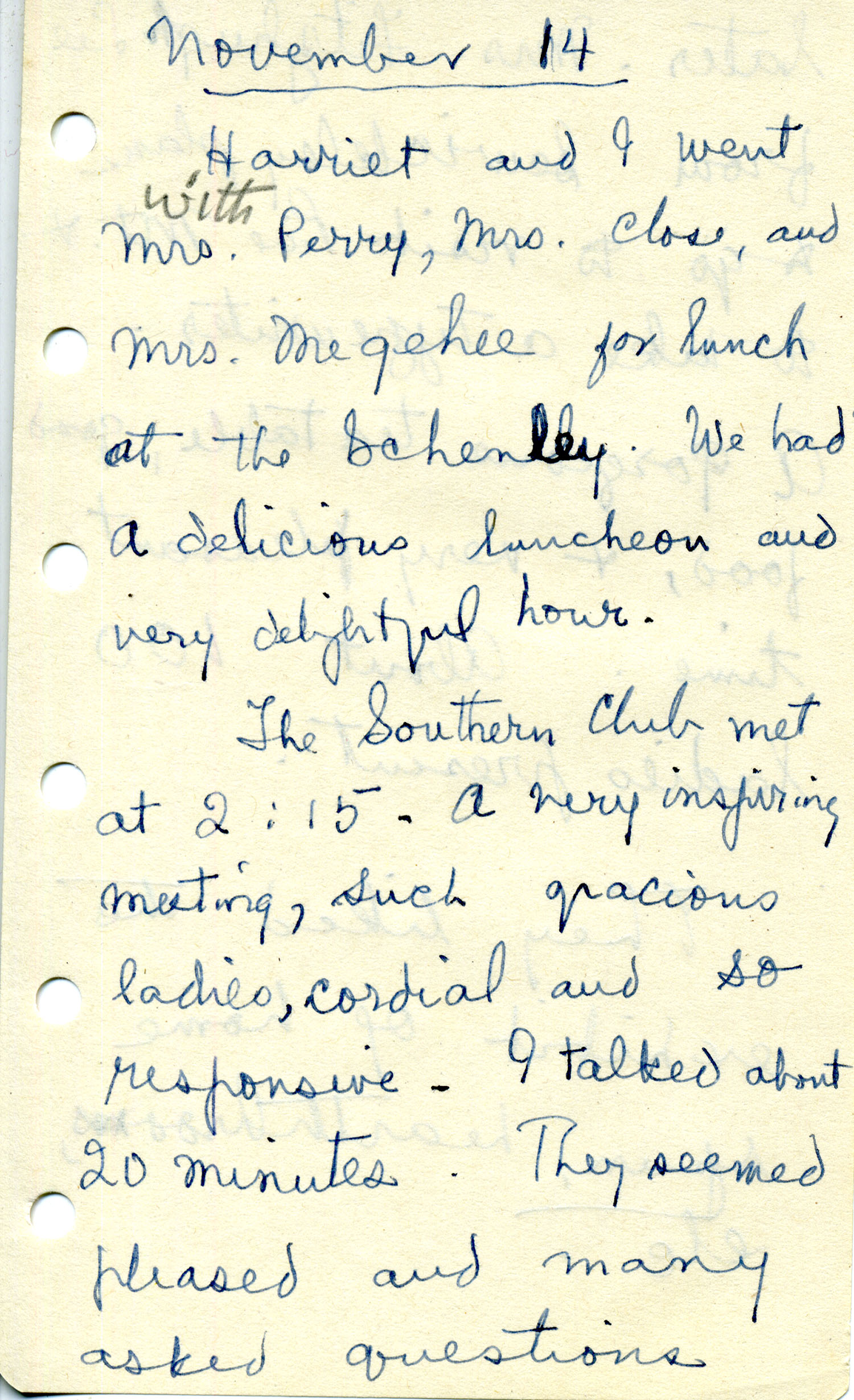 November 1[?] | Hotel Schenley | Southern Club | 100 | Very good meeting |