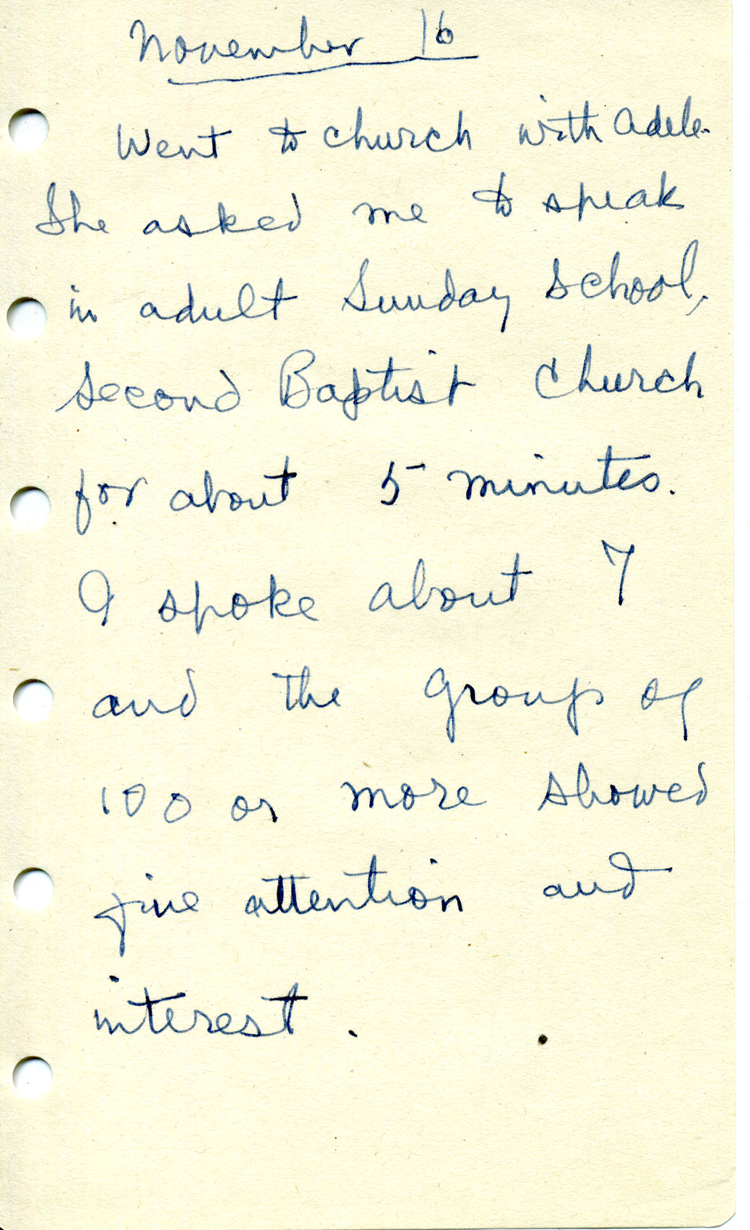 November 16 | Second Baptist Church, Philadelphia | Mrs. Frank Levering | 150 | |