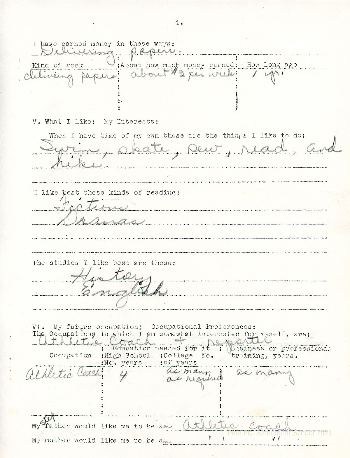 Applicant lists schools attended, teachers, grades through ninth grade. … I should like to stay in school through the 11th grade, and then take as many as possible years in college. Her parents agree.