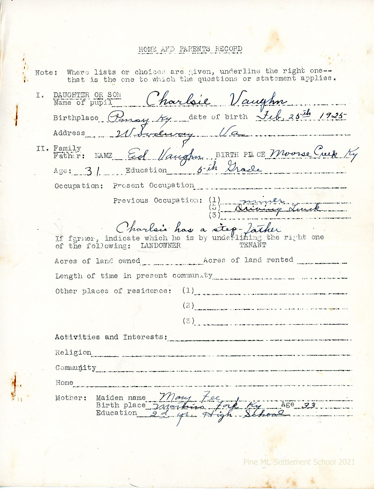 [001a] January 18, 1940. STUDENT APPLICATION BLANK for Charlsie Vaughn. [Contains similar information as that in 001b]