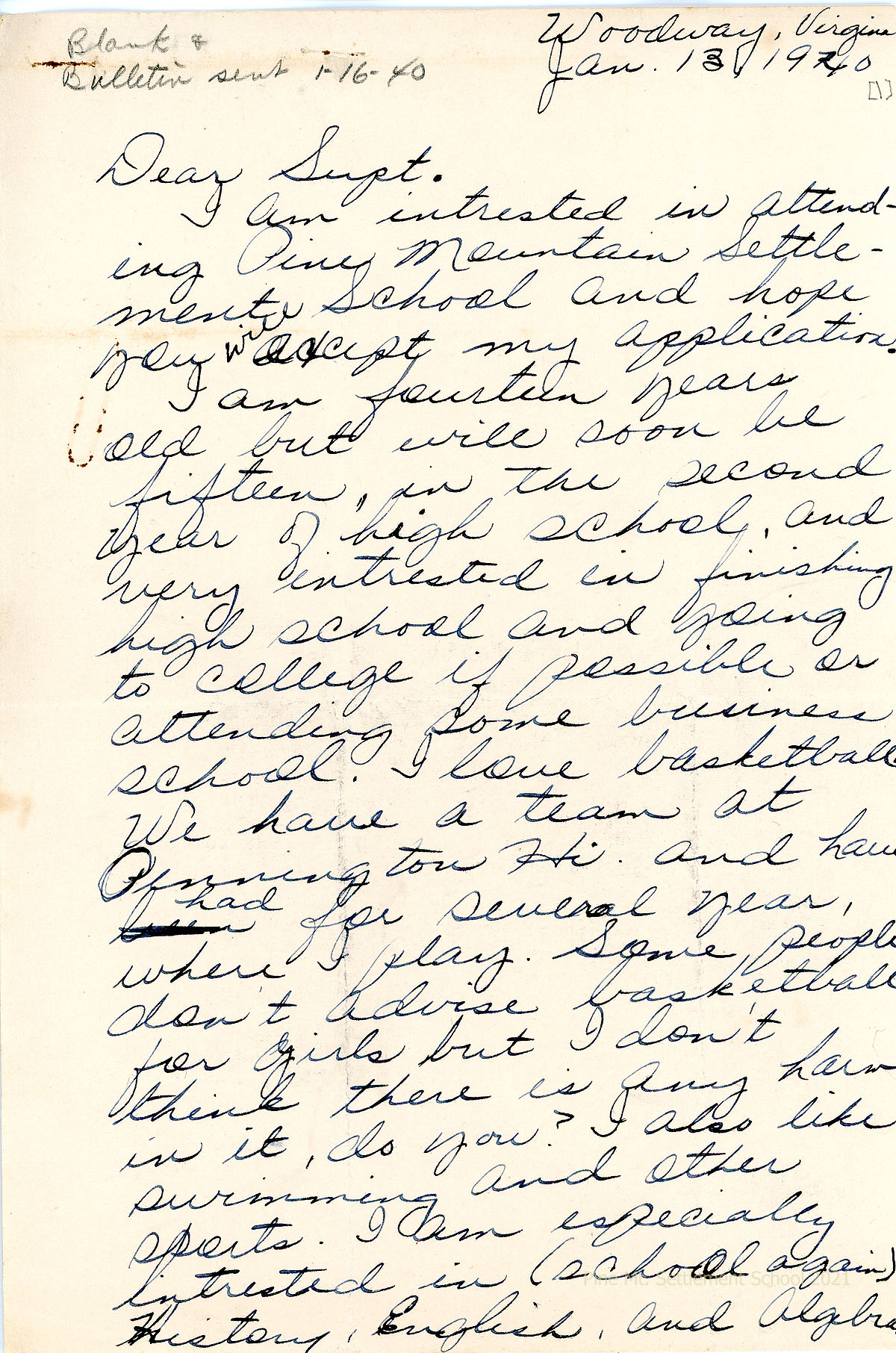 [006a], [006b] January 13, 1940. Two-page letter to “Supt.” from Charlsie in Woodway, VA, expressing interest in attending PMSS; provides information about herself. She has played basketball at Pennington H.S. for several years. “Some people don’t advise basketball for girls but I don’t think there is any harm in it, do you?” She writes about knowing Nell (Ruth) Shuler and Charlie Mae Lawson, who were at Grace Nettleton Home, Harrogate, TN, when she was there about 5 or 6 years ago.