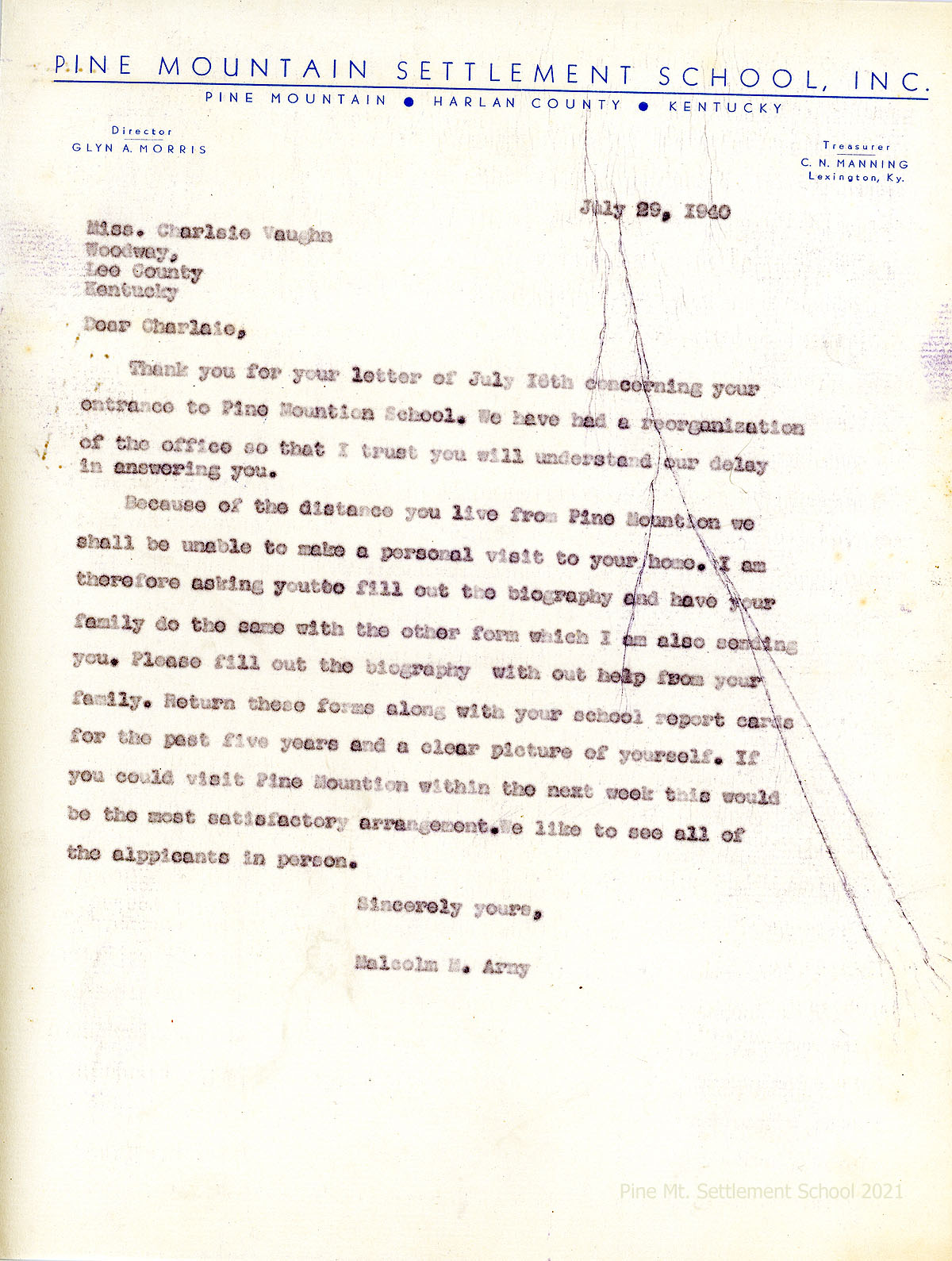 [10] August 23, 1940. To “Sir” from Charlsie, asking for the School’s decision whether to accept her at PMSS this fall.