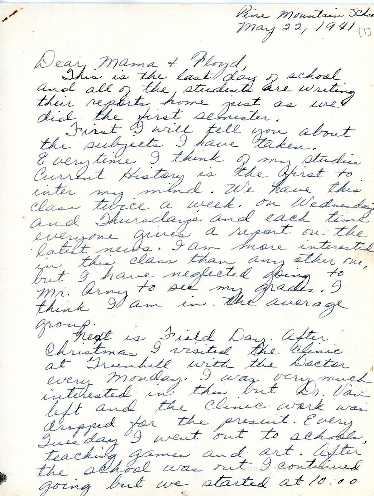 [15a] through [15e] May 22, 1941. Five-page self-evaluation letter from Charlsie to her parents, “Mama and Floyd,” describing her second semester. She describes her efforts in Current History which interests her most, Field Day, during which she “visited the clinic at Greenhill (sic, Green Hills?) with the Doctor every Monday” until Dr. Van (Preston J. Van Kolken) left and the clinic ended. She and Gwen (Hendren) also visited schools to teach games and art and [015b] do cooking and cleaning. “For the last two weeks Gwen and I have been home visiting, making a map for the new Doctor that is to come. On these visits I learned more about the community than I had the whole year.” She connects this experience with her Sociology studies, taught by Mrs. [Birdena] Bishop. “It teaches you how to associate with different kinds of people.” Charles describes what she learned in Hygiene, which Mrs. Bishop also teaches, [015c] English (Greek mythology, ballads), Ethics, and Art (linoleum blocks, manuscript writing). [015d] She worked in several houses, including the Cabin, Old Log, Workshop and is “trying not to be as sociable as I have been while working.”