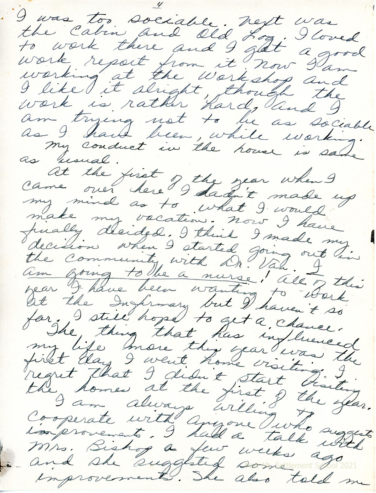 “At the first of the year, when I came over here, I hadn’t made up my mind as to what I would make my vocation. Now I have finally decided. I think I made my decision when I started going out in the community with Dr. Van. I am going to be a nurse! All of this year I have been wanting to work at the Infirmary but I haven so far. …”