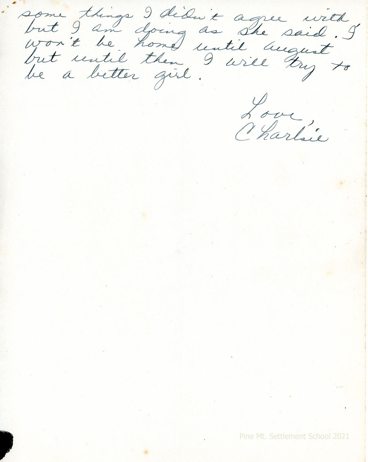 [12] December 24, 1940. To Mr. and Mrs. Floyd Qualls from [unsigned], Principal, enclosing Charlie’s self-evaluation letter for the first term. “…Charlsie has made a fine adjustment to the pattern of life at Pine Mountain and..she is becoming a worthy citizen in our school community.” He then lists a few areas that need improvement.
