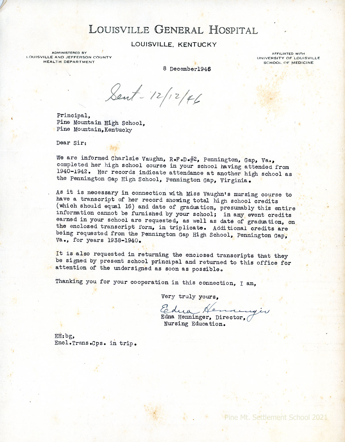 [025] December 8, 1946. To PMSS Principal from Edna Henninger, Director, Nursing Education, Louisville General Hospital, requesting Charlsie’s PMSS records for 1940-1942. A request for transcripts for her time (1938-1940) at Pennington Gap (VA) H.S. has also been made.