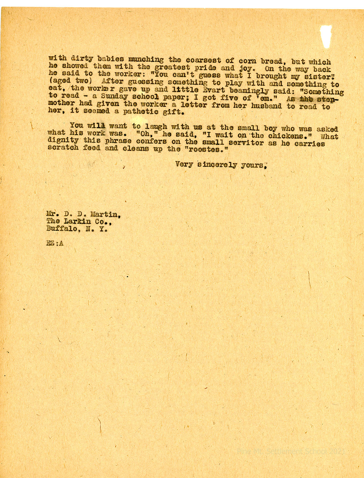 001-002 Date is truncated. [Notation: “c. January 1925”], two pages. EZ (Ethel de Long Zande) to Darwin D. Martin, ordering hot water bottles, albums, and writing cases to be paid for by “money given us for Christmas.” Zande and Miss [Bessie V.] Gaunt [PMSS bookkeeper] are gathering insurance material for Martin. Provides updates about the road: A recent vote against a bond issue has delayed completion. The School is keeping the road in order, as the State will do nothing without funds. There is a quarrel between the State Road Commission and the State Engineer, who has resigned. Describes the ideas for a road to carry the lumber. “…[T]he county built a fairly good road down this side of the mountain so that our neighbors are hauling continually and so that the mail comes in and out by this route by wagon.” Tells about a newly arrived Evert, an 11-year-old boy whose father was jailed for making moonshine, leaving his family destitute.