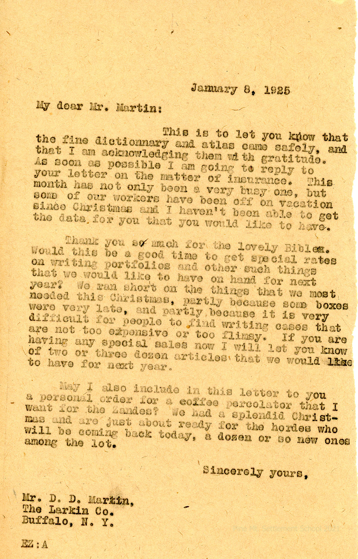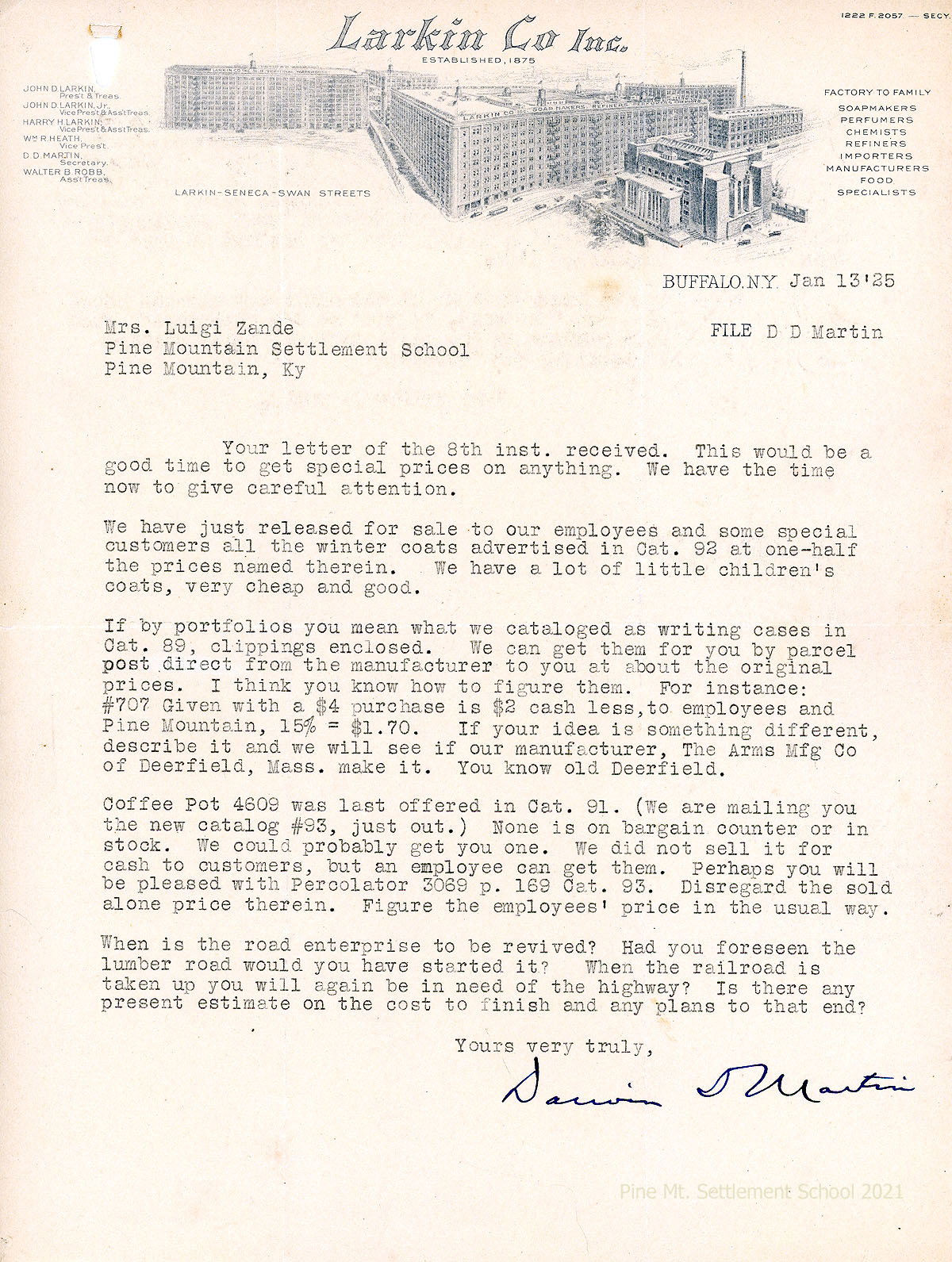 004 January 13. Martin (on letterhead for Larkin Co. Inc., Buffalo, NY) to Mrs. Luigi Zande, telling her that winter coats are on sale; lists the prices (special for PMSS) for portfolios (writing cases), made by the Arms Mfg. Co. of Deerfield, MA, and the coffee pot. Asks several questions about the road.