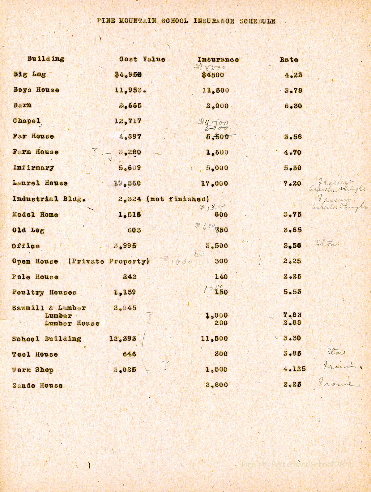 006 Enclosure in Zande’s letter of March 28, 1925, to Martin, with notations. “Pine Mountain School Insurance Schedule,” with data in columns for Building, Cost Value, Insurance, Rate.
