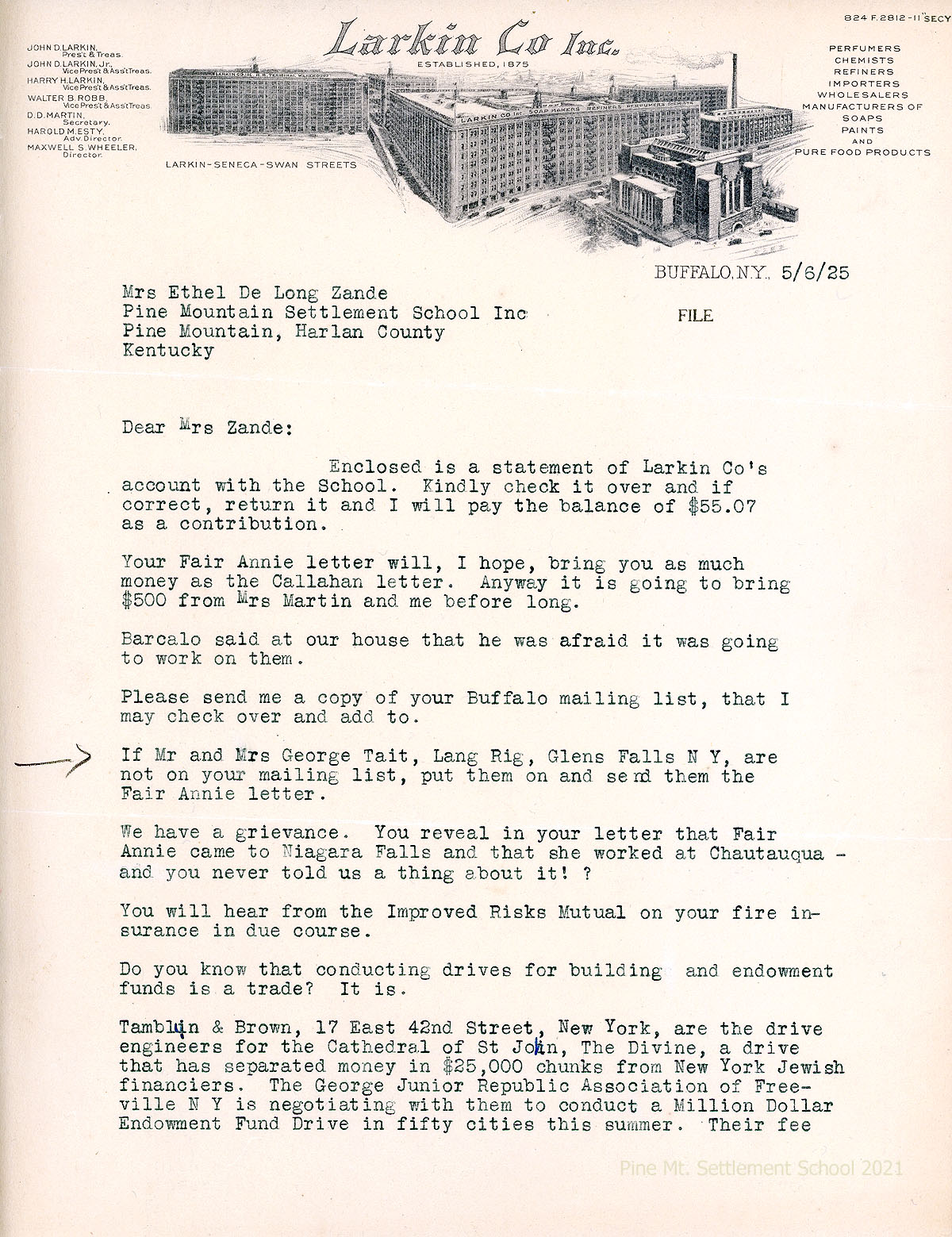 010-011 May 6. Two-page letter from Martin to Mrs. Zande, enclosing a statement and offering to pay it “as a contribution.” and pledging an additional $500. Asks for PMSS’s Buffalo mailing list so he can add to it; advising adding Mr. and Mrs. George Tait, Glens Falls, NY, to the list. Informs Zande that “conducting drives for building and endowment funds is a trade…” and gives examples of clients of Tamblin and Brown in NYC. He doesn’t think PMSS is ready for an endowment campaign but “it is well to know about it.”