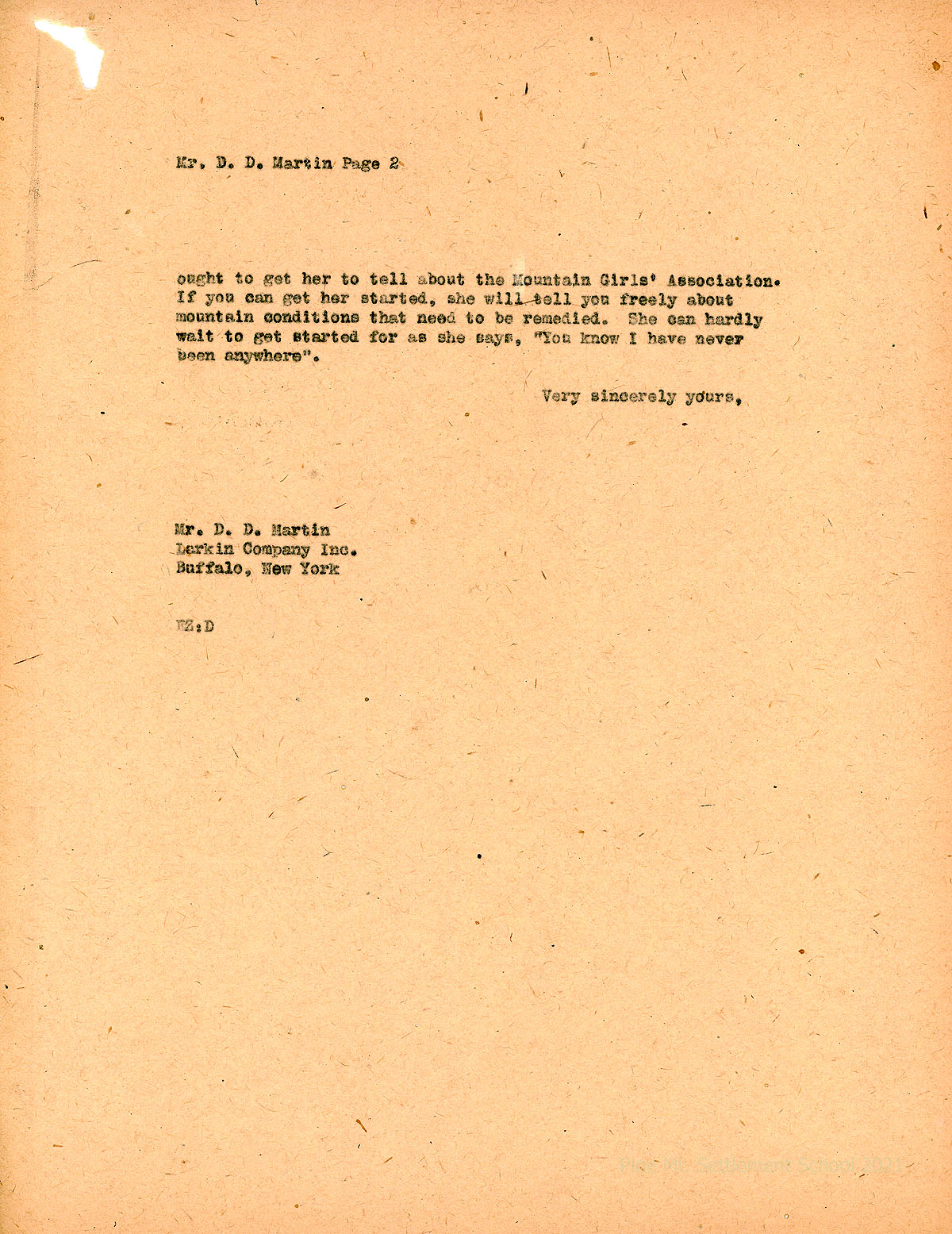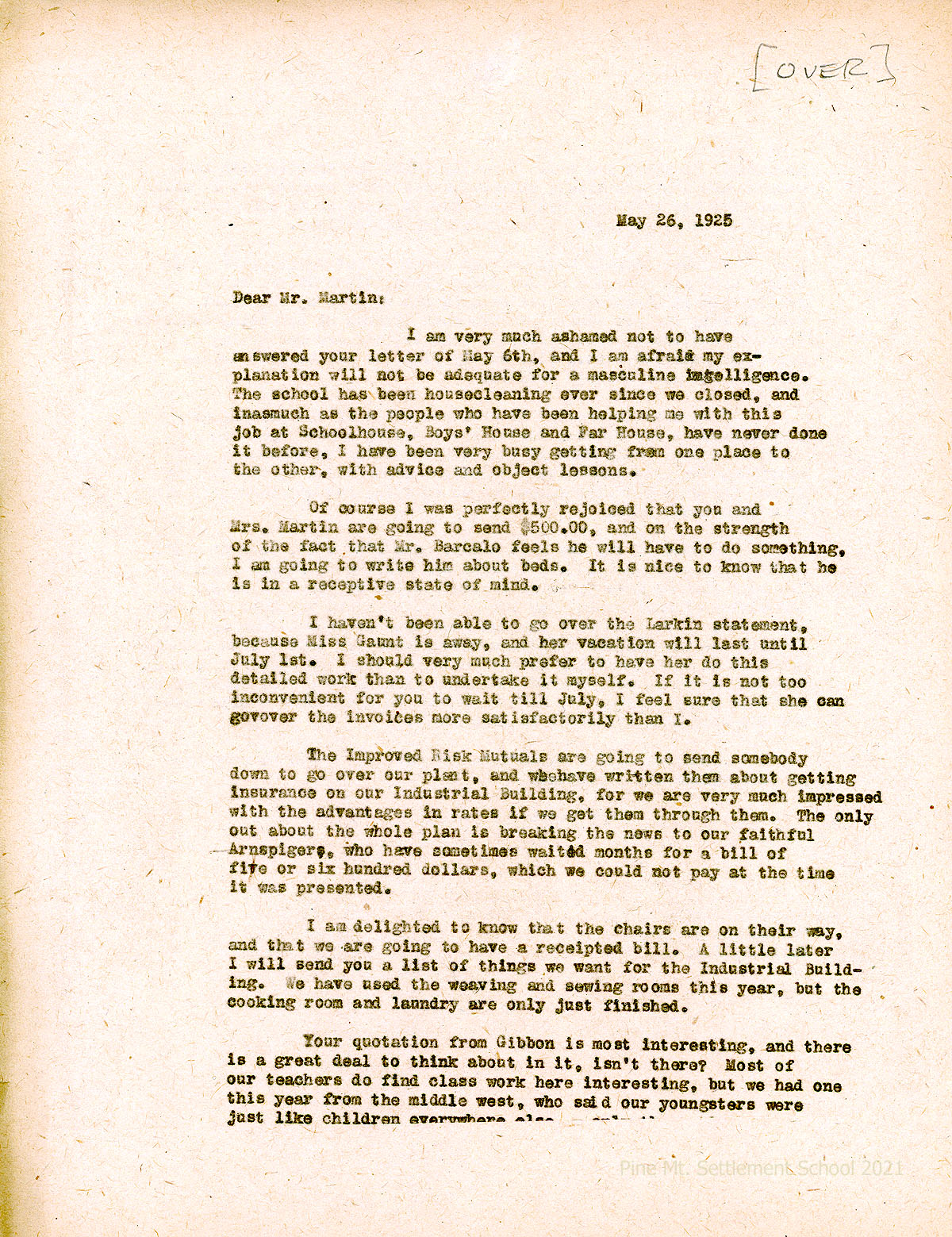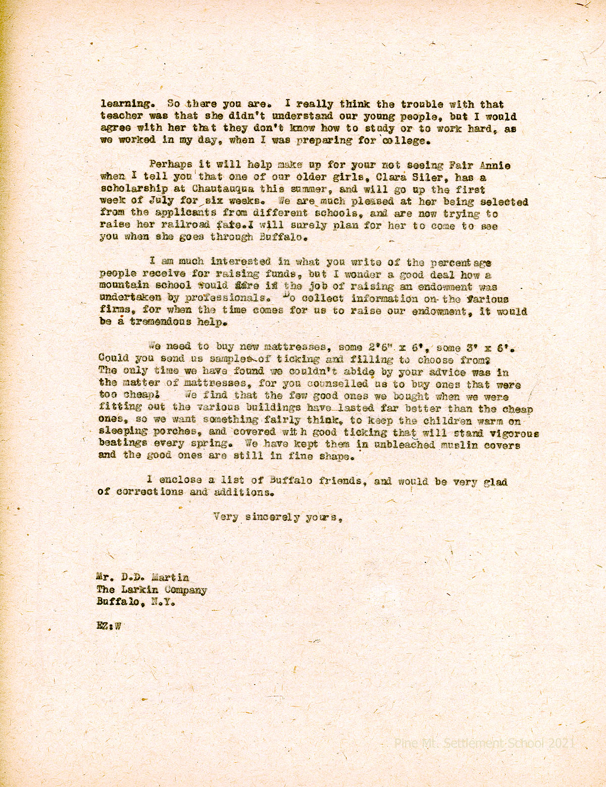 013-014 May 26. Two-page letter from EZ (Zande) to Martin, [013] explaining she was late in responding due to overseeing the School’s house cleaning. Appreciates Martin’s $500 pledge; Mr. Barcalo’s interest in helping; will wait for Miss Gaunt’s return from vacation to review the Larkin statement; Improved Risk Mutuals is sending someone to visit PMSS. She regrets leaving “our faithful Arnspiger” for a new insurance company. Zande will send a list of needs for the Industrial Building. “We have used the weaving and sewing rooms this year, but the cooking room and laundry are only just finished.” [014] As for paying for fundraising services, “…I wonder a good deal how a mountain school would fare if the job of raising an endowment was undertaken by professionals.” She asked Martin to provide more information on various firms as it will help in the future. Zande orders new mattresses, provides specifications, and explains why they must be thick and strong. Encloses Buffalo mailing list.