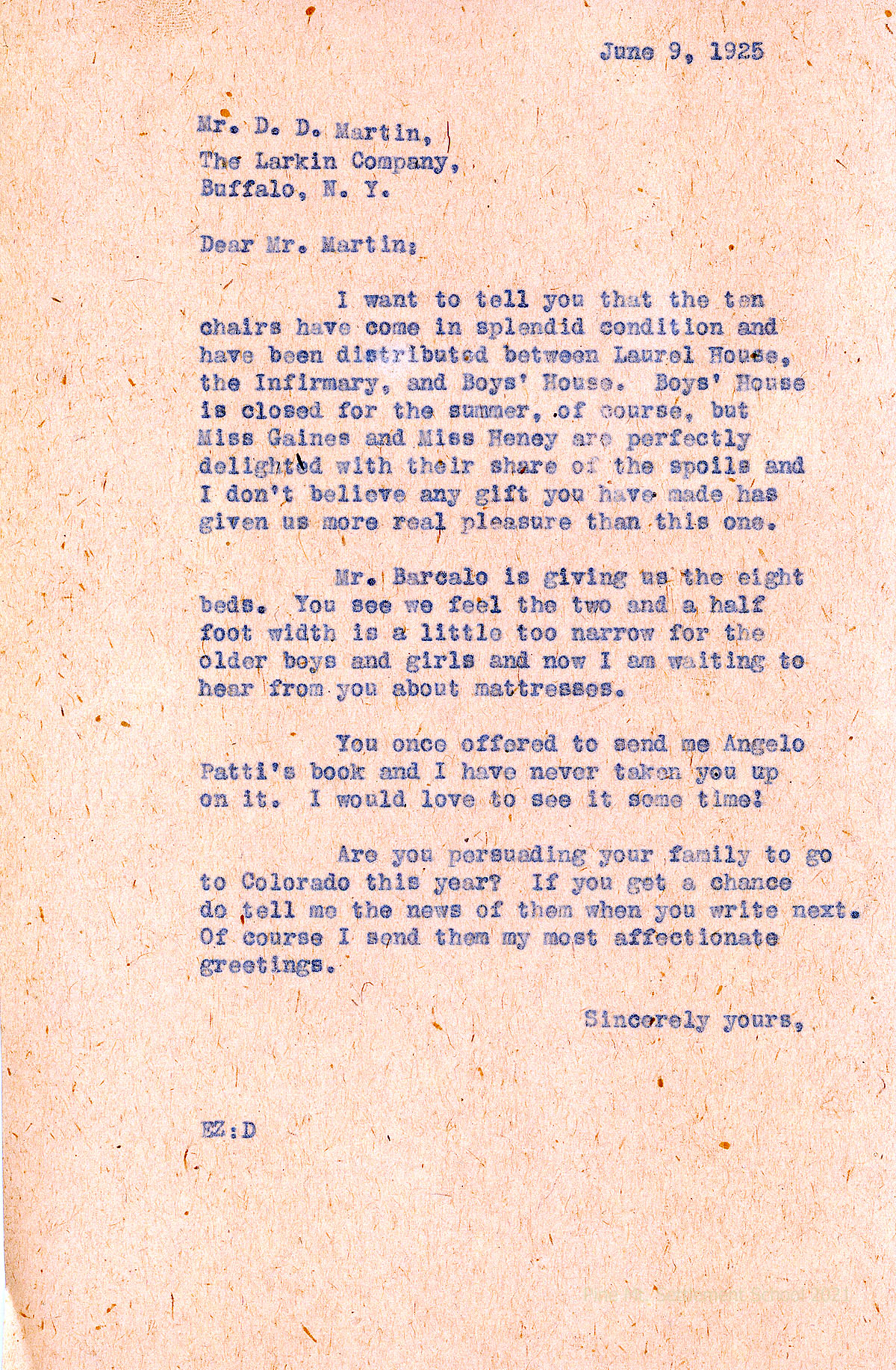 019 June 17. Martin to Mrs. Ethel Zande. He has ordered the Angelo Patri book; has vacation plans other than Colorado. “… Darwin [son] is in New York with Baker Kellogg & Co., NYC, for the summer; asks if she will accept “Barcalocots” with mattresses at $7, which he will pay as his PMSS contribution.
