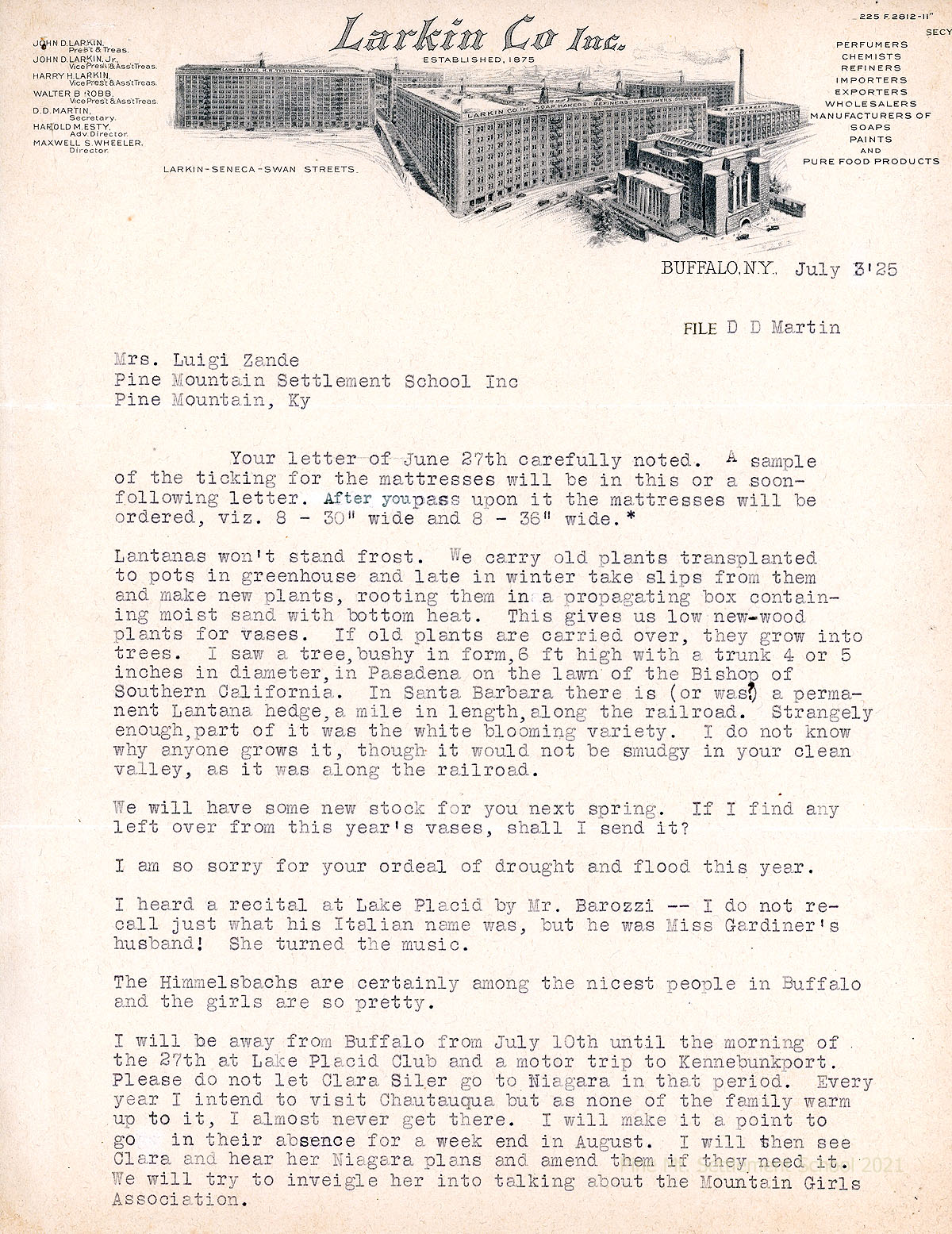 024-025 July 3. Two-page letter from Martin to Mrs. Luigi Zande, responding to her June 27 letter about her cots and mattress orders; advises on care of lantanas. Mentions a recital by Mr. Barozzi (Miss Gardiner’s husband) and the Himmelsbachs of Buffalo. Describes his vacation plans; will meet Clara Siler at Chatauqua. Mentions Darwin’s career plans. Edited and added to the Buffalo mailing list.