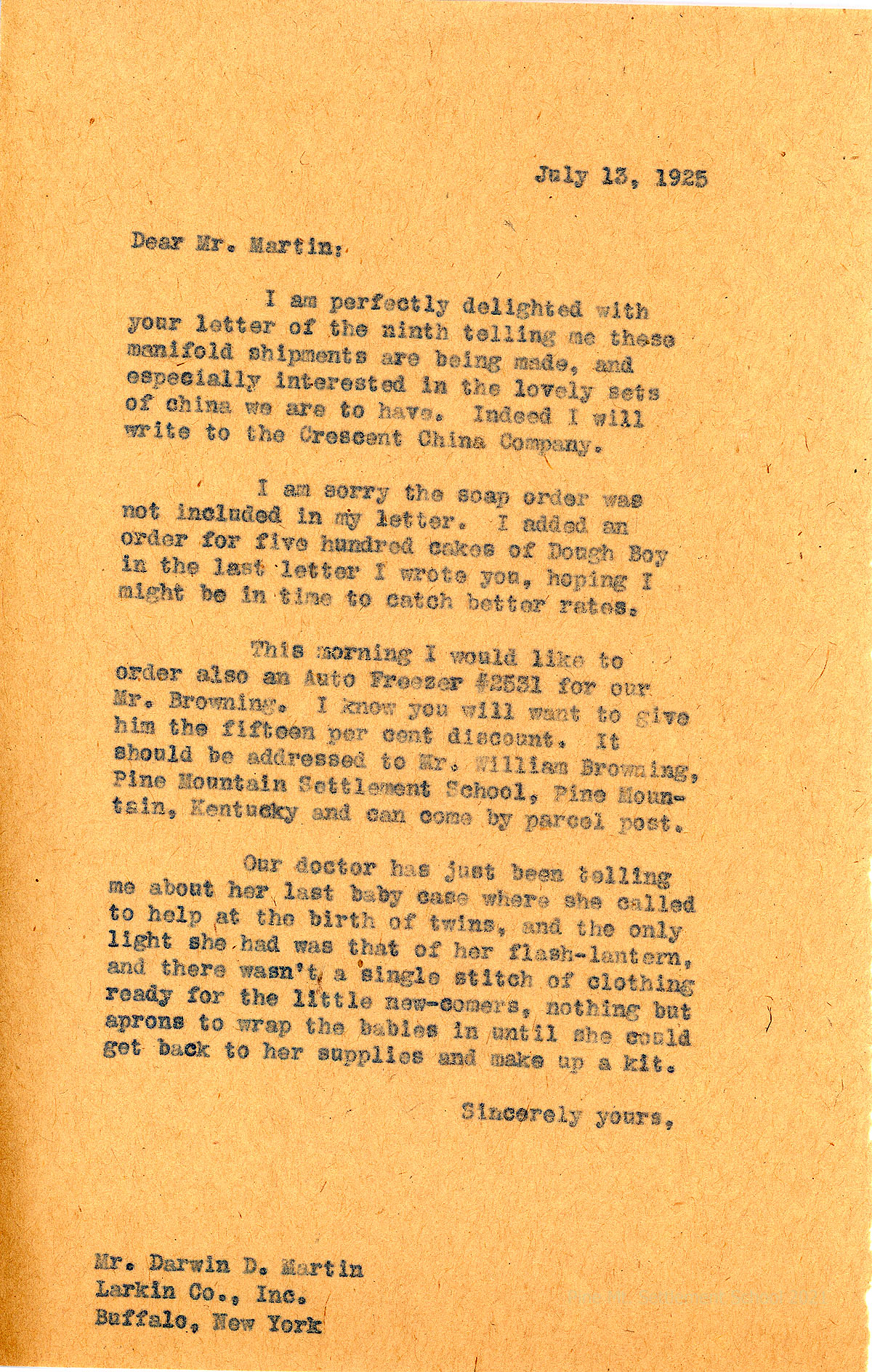 027 July 13. (Unsigned, likely Zande) to Martin. Looking forward to receiving the shipments; will write to the Crescent China Company. Has ordered cakes of Dough Boy soap in order to get better shipping rates; also ordered auto freezer for William Browning [PMSS Farmer]. Tells a story from the doctor about helping at the birth of twins.