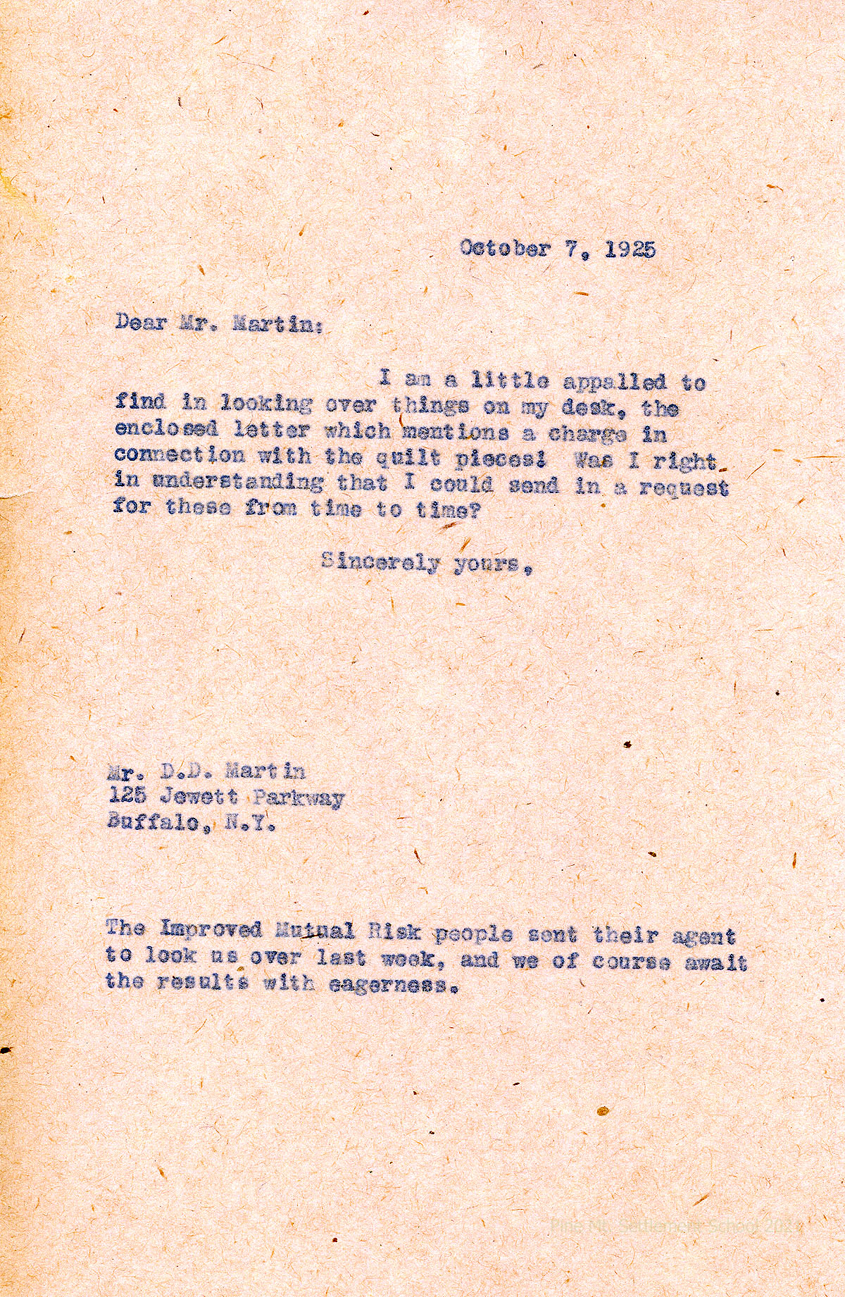 033 October 7. [Unsigned, likely Zande] to Martin, asking about a charge for the quilt pieces. The Improved Mutual Risk agent has visited PMSS.
