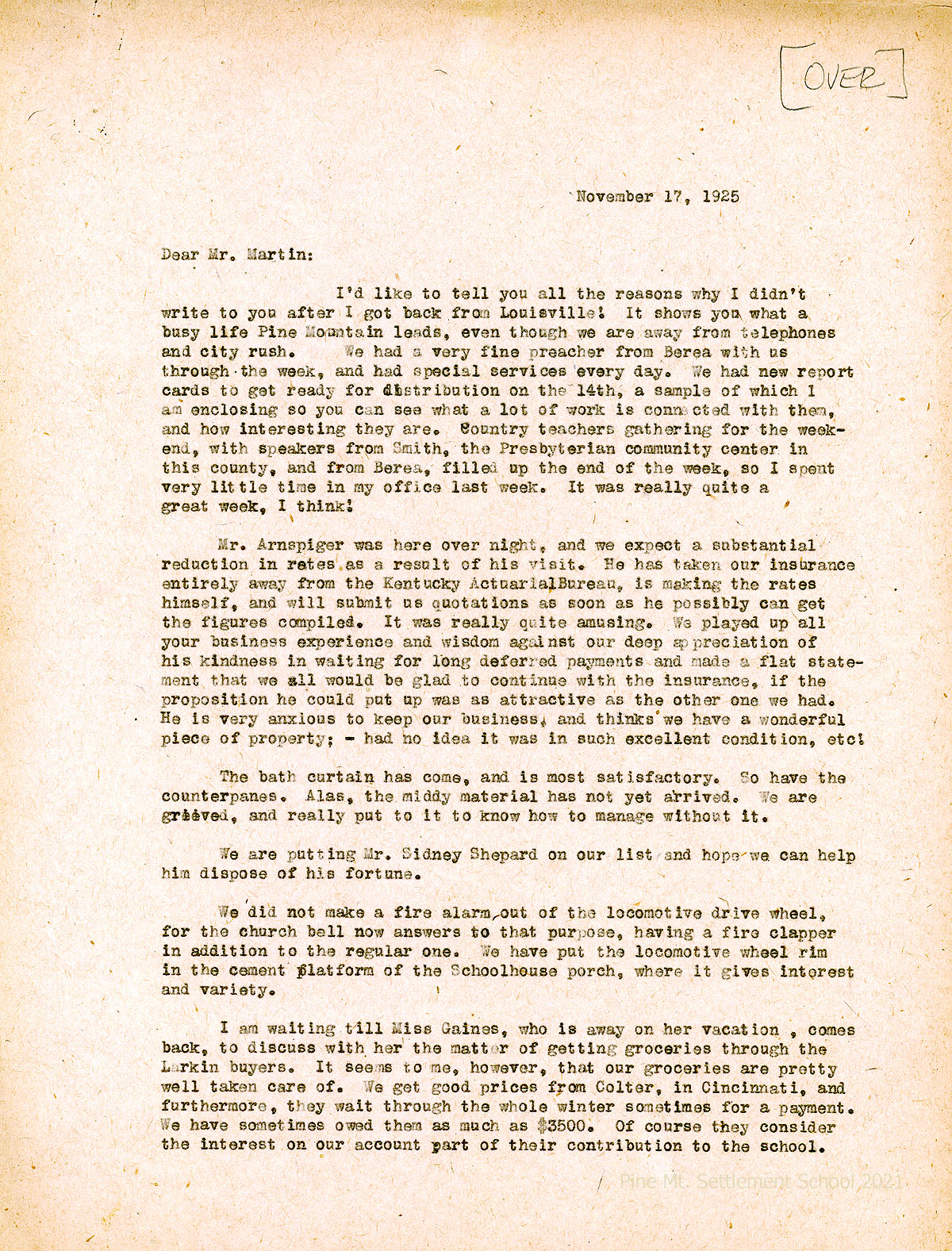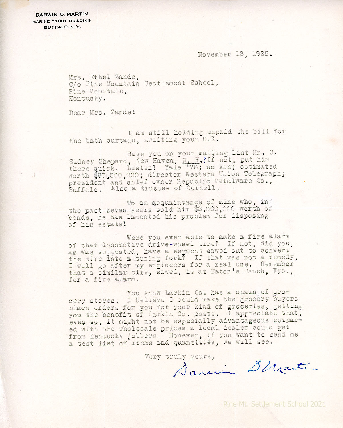 037 November 13. Martin to Mrs. Ethel Zande, waiting for her to okay the bill for the bath curtain. Suggests a name for the PMSS mailing list (Mr. C. Sidney Shepard of New Haven, NY) and describes his background. Asked whether the School was “able to make a fire alarm of that locomotive drive-wheel tire….” Reminds Zande that “Larkin Co. has a chain of grocery stores” and suggests that he could arrange the ordering of PMSS groceries from them wholesale.