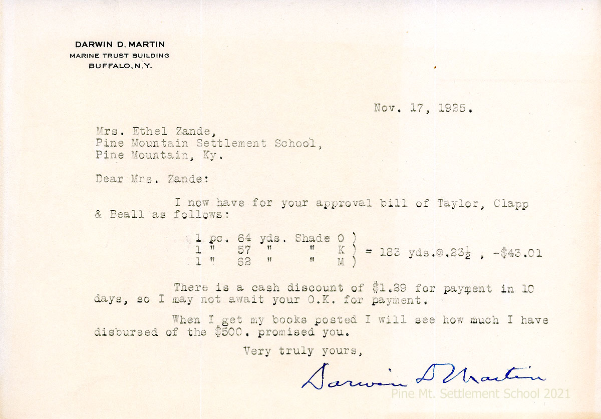Had the deep identification with those who strive to better their lives not been present in Darwin D. Martin, in the Creeches, and in Ethel de Long Zande, and co-founder Katherine Pettit, it is unlikely Pine Mountain would have persisted. Because Martin did persist as an advisor, champion, and benefactor for Pine Mountain Settlement School during some of its most productive years, he built a foundation for all the dreams and the dedication that followed at the School.