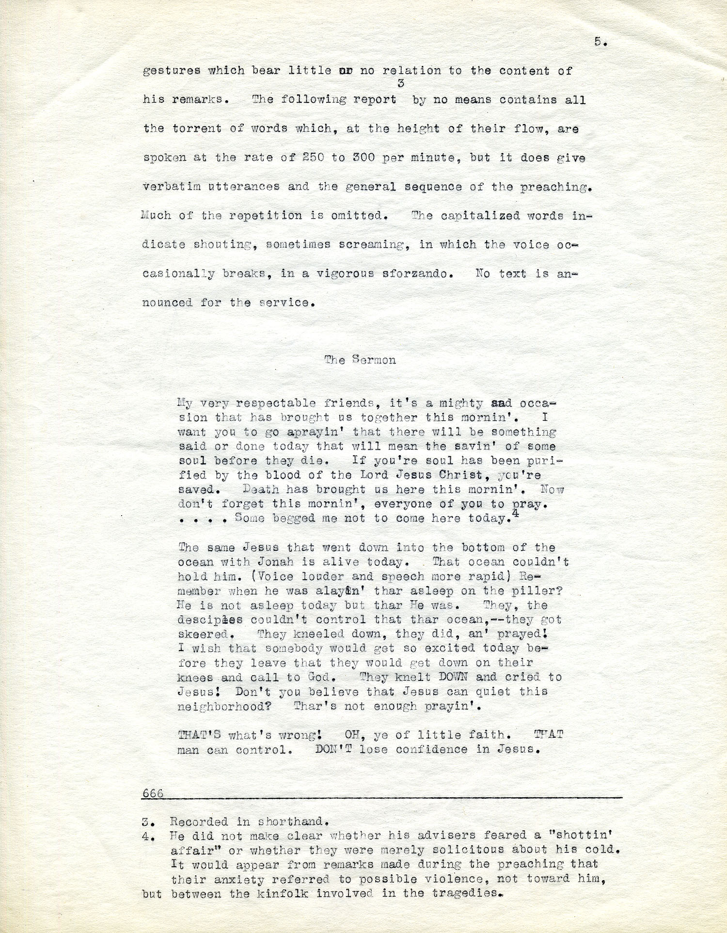 The preacher, having satisfied himself that his audience is in a tolerably comfortable and receptive mood, sets forth on his discourse, beginning in what may be termed a normal delivery, both as to voice and gesture. His speech accelerates as he proceeds. The sermon is marked by superfluous repetition, by emphases, loud shouted exclamations, and [page 005] gestures which bear little or no relation to the content of his remarks. The following report (3.) by no means contains all the torrent of words which, at the height of their flow, are spoken at the rate of 250 to 300 per minute, but it does give verbatim utterances and the general sequence of the preaching. Much of the repetition is omitted. The capitalized words indicate shouting, sometimes screaming, in which the voice occasionally breaks, in a vigorous sforzando. No text is announced for the service.